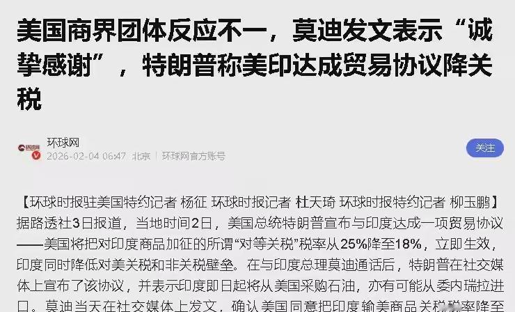 特朗普刚对印减税,不到24小时,莫迪直接变脸,美国商界骂声一片 2月2日美印通话后,特朗普单方面宣布“降税换印方停购俄油+5000亿美元采购”,莫迪仅感谢降税、回避核心承诺,24小时内印度官方进一步否认关键条款,美国商界随即爆发批评。 一、交易“罗生门” 美方口径(特朗普社媒,2月2日): 美国对印“对等关税”由25%降至18%,并取消因印购俄油加征的25%额外关税,综合税率由50%降至18%。 印方承诺:停止购买俄油、5年采购美能源/农产品/科技等超5000亿美元、对美降关税与非关税壁垒至零。 印方回应(莫迪社媒,2月2日):仅感谢美方降税至18%,称利好“印度制造”,只字不提停购俄油与5000亿美元采购 。 24小时反转(印方官员,2月3日):企业购俄油属商业行为,政府不干涉;5000亿美元无具体目录与时间表,降税为“逐步推进”,无明确幅度与节点。 二、美国商界:骂声一片 “我们支付关税”联盟(800+小企业):怒批协议对美企“加征600%税收”,2024年对印关税仅2%-3%,现升至18%;若印不停购俄油,关税或再上调,企业将双重受损 。 美国商会:谨慎乐观,称是“全面贸易协定的第一步”,但需研究细节,未认可协议为“胜利” 。 农业与能源企业:期待落空,印度年自美进口约410亿美元,5000亿美元目标缺乏可行性,芝加哥期货豆粕合约应声小跌。 三、局势研判 特朗普动机:为大选造势,以“外交胜利”讨好商界与选民,同时推进反俄能源联盟。 莫迪策略:先拿实惠、回避承诺,避免损害与俄能源合作及国内能源安全,以模糊表态保战略自主。 协议实质:无官方文本、无执行时间表,更像“政治表演”,落实风险高。 后续风险:美方或再施压,印方继续模糊应对,贸易摩擦或重启,影响供应链与市场预期。