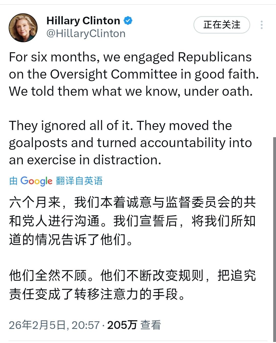 美国前国务卿希拉里·克林顿昨晚(北京时间2月5日晚)愤怒地写道:“六个月来,我们本着诚意与监督委员会的共和党人进行沟通。我们宣誓后,将我们所知道的情况告诉了他们。他们全然不顾。他们不断改变规则,把追究责任变成了转移注意力的手段。所以,让我们停止这些游戏吧。如果你想打架,詹姆斯·科默(共和党众议院监督委员会主席),那就来吧公开地打。你总是喜欢谈论透明度。但还有什么比公开听证会更透明的呢?当然是全程摄像机对着!我们会到场。” [机智]评几句:希拉里因共和党临时改规则暴怒,本质是美式党争狗咬狗的闹剧,希拉里的指责不过是五十步笑百步,纵观其政治生涯,邮件门等丑闻早已让她劣迹斑斑,所谓诚意沟通本就站不住脚,如今跳脚叫嚣公开听证,不过是借所谓透明度话术转嫁自身危机。另一方面,比尔·克林顿主张无条件无涂黑公布所有爱泼斯坦文件、追求完全透明公开的立场值得认可,该文件确实不应该被特朗普单方面操控,唯有彻底公开才能撕开美国权贵圈层的遮羞布。但是说到底,听证规则反复横跳、权贵丑闻遮遮掩掩,全是美国政坛内部的腌臜事,两党只顾互相撕咬攻讦,从未真正追求公正与真相,国际社会只需搬好小板凳吃瓜看戏,看这场美式民主的丑剧如何继续上演。