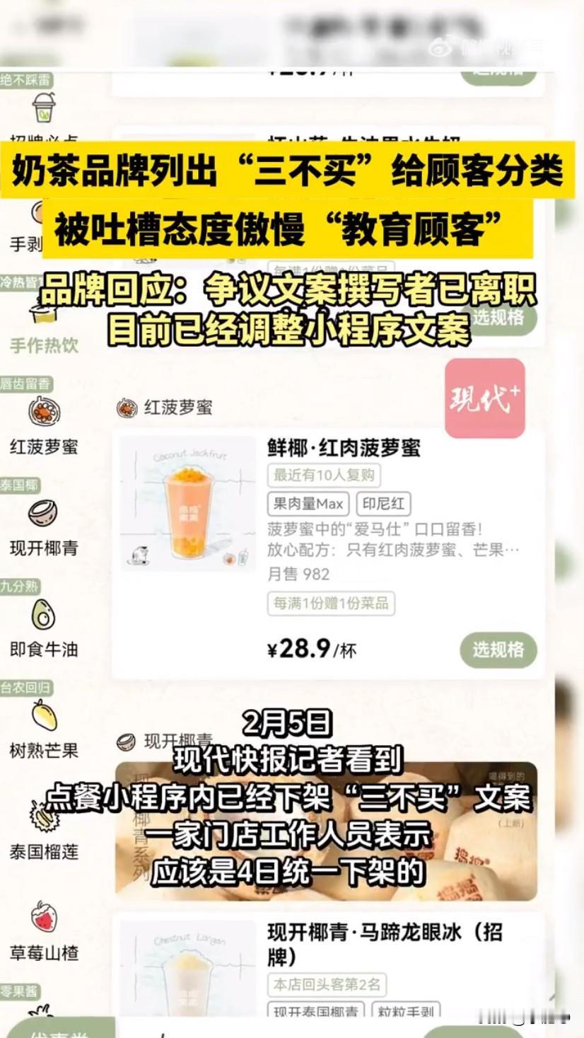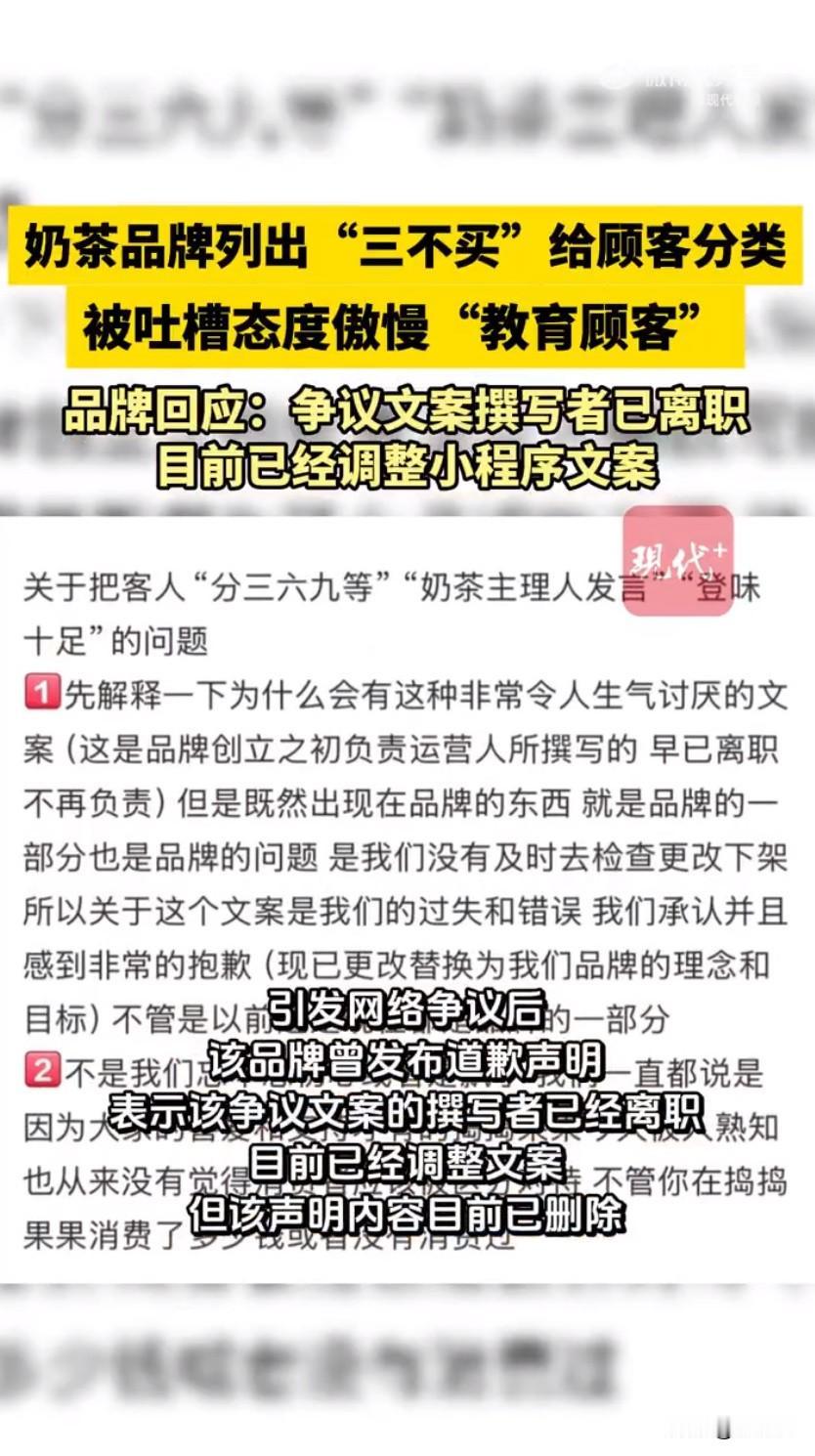 广西南宁的本土奶茶品牌捣捣果果,因为点单小程序里的一番操作直接引发网友吐槽,小程序里明确列出“三不买”,让三类消费者谨慎下单,被大家吐槽态度太傲慢,妥妥的是在教育顾客,这波操作也让不少网友直呼喝个奶茶还被区别对待,实在离谱。有网友在社交平台晒出截图,这个品牌的点单小程序里,专门有一栏写着“以下三类人谨慎下单”,明晃晃列出了“三不买”的标准,分别是十分注重包装还盲从大品牌的、对优质水果价格没基本认知的,还有喝不出味道差别,被品牌称作“木舌头”的消费者,最后还加了句“请自觉对号入座”,字里行间的优越感都快溢出屏幕了。不仅如此,品牌还对应列了“三买”的人群,都是追求果肉口感、有生活品位和经济能力的,这明摆着把顾客分了三六九等,直接踩中了消费者的雷区。大家本来点杯奶茶就是图个开心,结果还得先被品牌挑挑拣拣,不少网友看完都炸了,纷纷吐槽这哪是卖奶茶,简直是在搞消费者PUA,奶茶行业说到底是服务业,这么说话也太不把顾客当回事了,还有人直言“就算奶茶再好喝,这态度也让人没了购买的欲望”。随着吐槽的声音越来越大,这事也在网上越传越广,品牌这才赶紧出来回应,先是发了道歉和情况说明,称这些争议文案是品牌创立初期的运营人员写的,现在这位运营早就离职了,是因为没及时检查更新,才让这些内容一直挂在小程序上,还表示已经把相关内容替换成了品牌理念。可让人没想到的是,这份道歉声明没挂多久就悄悄下架了,这波敷衍的操作更是让网友不满,大家直言就算是离职员工写的,品牌也有审核的责任,不能一出事就把锅甩给别人,道歉发了又删,根本没半点诚意。之后有记者联系到品牌的线下门店,工作人员表示小程序里的“三不买”提醒已经按总部要求统一下架了,只是当记者想进一步联系品牌公司时,公开登记的电话却始终无法接通,也没收到任何回复。其实大家反感的从来不是品牌注重品质,而是这种把顾客分等级的傲慢态度,奶茶行业竞争本就激烈,好好做产品、真诚对待消费者才是根本,靠这种方式彰显所谓的品牌个性,到头来只会惹来反感,消耗自己的口碑。 来源:现代快报