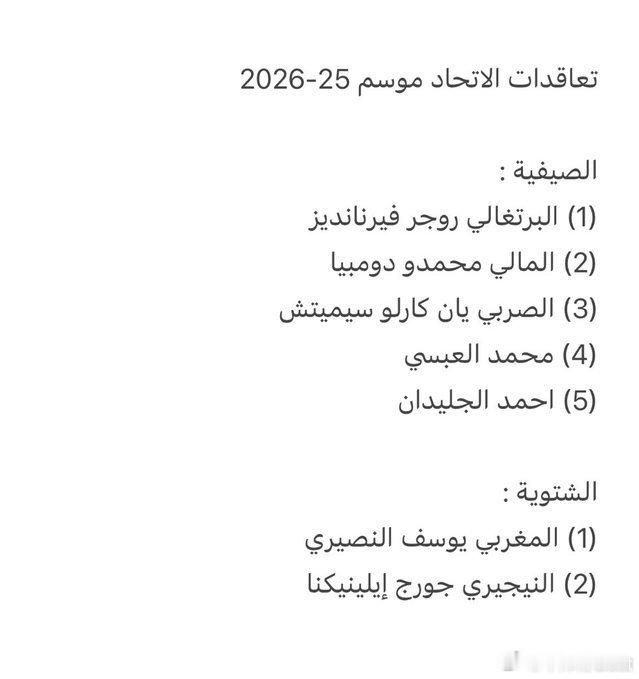 首先吉达联合在 2023-2024 赛季共签约15名球员其中5名外援10名本土球员在 2024-2025 赛季共签约11名球员其中7名外援 4名本土球员在 2025-2026 赛季共签约7名球员其中5名外援2名本土球员
