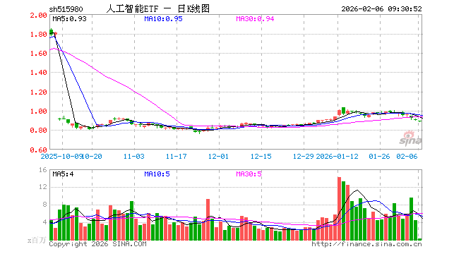 2月6日,人工智能ETF(515980)开盘跌1.11%,报0.892元。人工智能ETF(515980)重仓股方面,中际旭创开盘跌2.47%,新易盛跌1.81%,科大讯飞跌0.90%,寒武纪跌1.49%,金山办公跌0.82%,澜起科技跌1.87%,拓维信息跌0.61%,深信服跌1.21%,芯原股份跌3.69%。