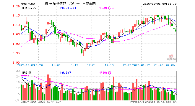 2月6日,科技龙头ETF工银(516050)开盘跌0.83%,报1.070元。科技龙头ETF工银(516050)重仓股方面,中际旭创开盘跌2.47%,新易盛跌1.81%,恒瑞医药跌0.72%,中芯国际跌1.48%,药明康德跌0.75%,海光信息跌1.00%,北方华创跌0.45%,胜宏科技跌1.24%,京东方A跌0.68%,兆易创新跌2.43%。
