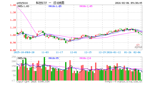 2月6日,科技ETF(515000)开盘跌0.98%,报1.007元。科技ETF(515000)重仓股方面,中际旭创开盘跌2.47%,新易盛跌1.81%,恒瑞医药跌0.72%,中芯国际跌1.48%,药明康德跌0.75%,海光信息跌1.00%,北方华创跌0.45%,胜宏科技跌1.24%,京东方A跌0.68%,兆易创新跌2.43%。
