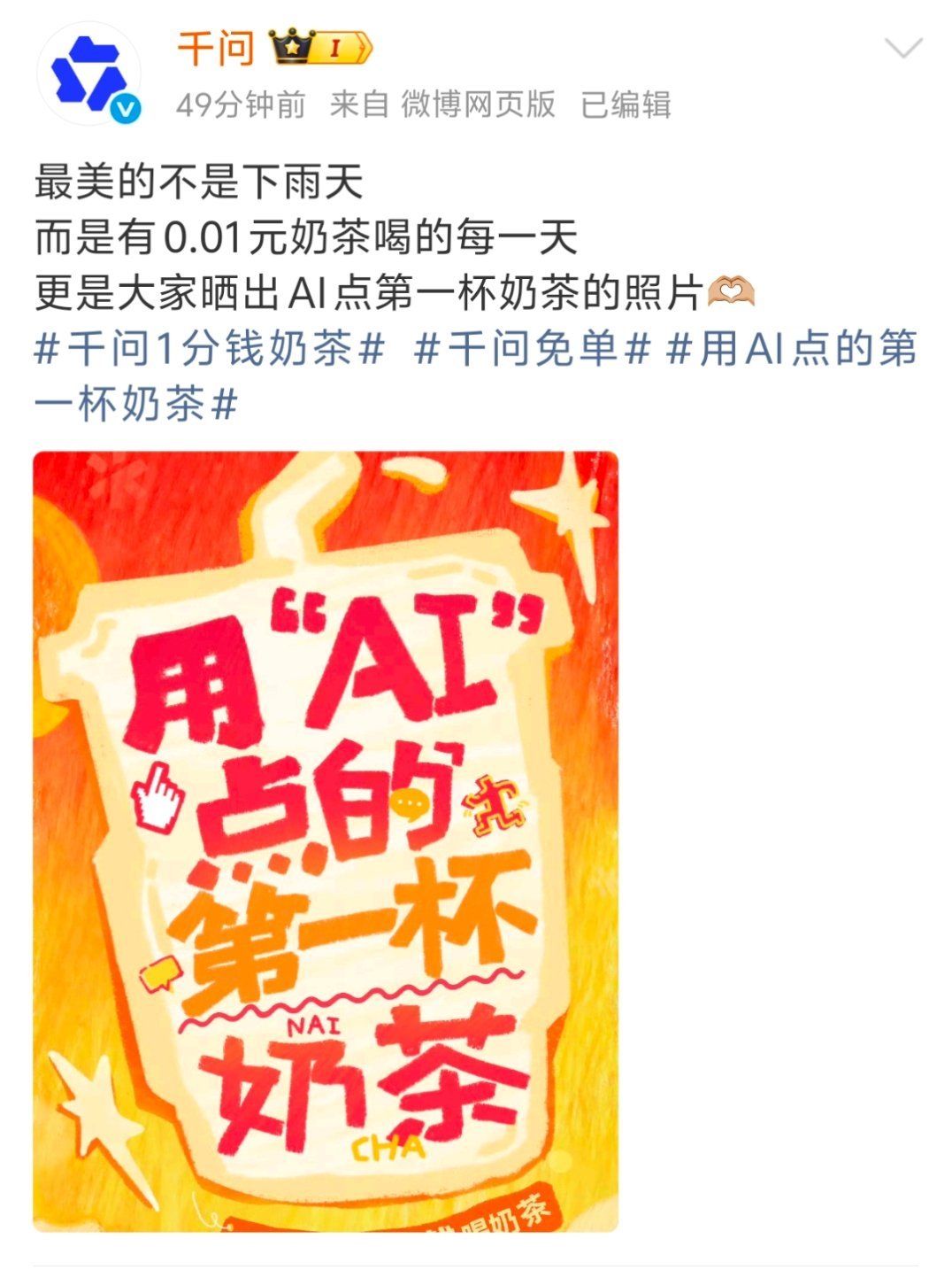 挪瓦为咖啡人喊话千问免单咖啡AI点奶茶我见过,但它一分钱点我是真等不了一点,也难怪挪瓦看到千问搞奶茶免单会那么发疯上火🔥,连发十条微博。有这好事不带咖啡玩,奶茶店爆单咖啡店只能看着疯狂的人群羡慕,那个气啊。我知道你很急,但是你先别急,千问请客,瓜分30亿,让我先去领一张25元免单卡,点一杯一分钱的奶茶,薅羊毛的事情真不能等!