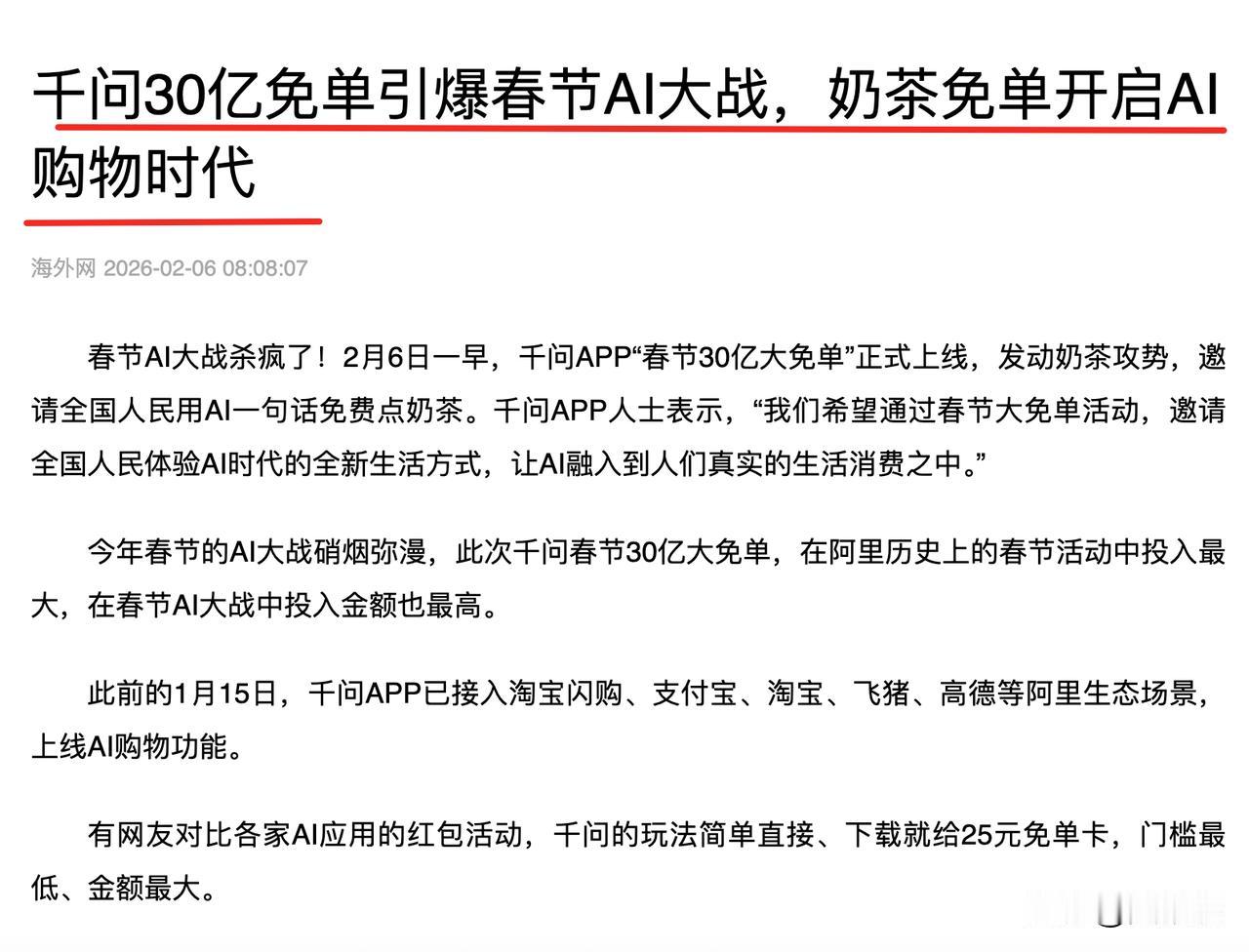阿里千问的这波福利,一定要去试试。 今天一大早,千问APP“春节30亿大免单”上线了。 第一波是请大家一句话免费喝奶茶,连请7天。 每个人在千问能领21张无门槛的25元免单卡,除了能1分钱喝奶茶,还能用来买年货、点外卖。 相当于这个春节千问给大家发了525块钱置办年货。 春节还没开始,千问就发力了,之所以敢力度这么大,还是因为底气足。 30亿是大厂春节大战中投入最多的公司。 并且这个操作是建立在千问能够解决实际问题、能办事的基础上。比如现在通过千问点个外卖、查个公积金、弄个PPT都非常方便,就是一句话的事儿。 可以这么说吧,有了千问之后,再也不用打开一堆软件,让人点来点去了。 当然,阿里千问能做到如此接地气,主要还是模型能力强。之前Meta在开发自己大模型的时候,蒸馏的都是阿里千问大模型,足以可见阿里千问大模型在AI领域的技术能力。 除此之外,更大的意义在于,这个春节之后阿里凭借独特的生态优势,能够打造出一条AI和现实生活紧密结合的路子,如果把这条路给走通了,既为中国AI发展找到了新的方向,还有可能推动消费变革,让大家进入AI生活消费的新时代,到时候会有无限的可能。