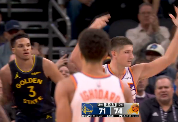 第三节比赛中,狄龙18中9砍下21分5篮板、阿伦14中7砍下21分5篮板,太阳下半场打出19-12反超勇士。