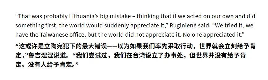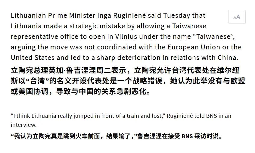 新加坡联合早报今天(2月6日)报道:“立陶宛总理星期二(2月3日)接受媒体采访时说,允许台湾在首都维尔纽斯开设以‘台湾’为名的代表处是战略性错误后,台外事部门强调,驻立陶宛‘台湾代表处’的名称是双方共识。” 四年前立陶宛居然与“台独”分裂势力同流合污、沆瀣一气,挑战中方的核心利益,现在中国驻立大使馆人去楼空,第一大贸易伙伴不再,新上任的立陶宛总理因加.鲁吉涅内大梦方醒:美国不表彰,欧盟不兜底,立陶宛得罪中国到底得到了什么?“我们自认为很勇敢,但却是跳到了飞驰的火车头前,自然是一败涂地”。但立方一方面跟中国求和,另一方面却又不肯放下身段,鲁吉涅内表示“尽管我们想恢复中立正常关系,但我们不会立即与中方拥抱在一起”;总统瑙塞达则声称,“过度依赖中国存在风险。如果中方想跟立方搞好关系,必须展现出足够的诚意”。这话说的让人啼笑皆非,谁求谁都没搞清楚。立陶宛想与中方恢复正常关系,必须立即纠正错误,中立关系方能转圜。