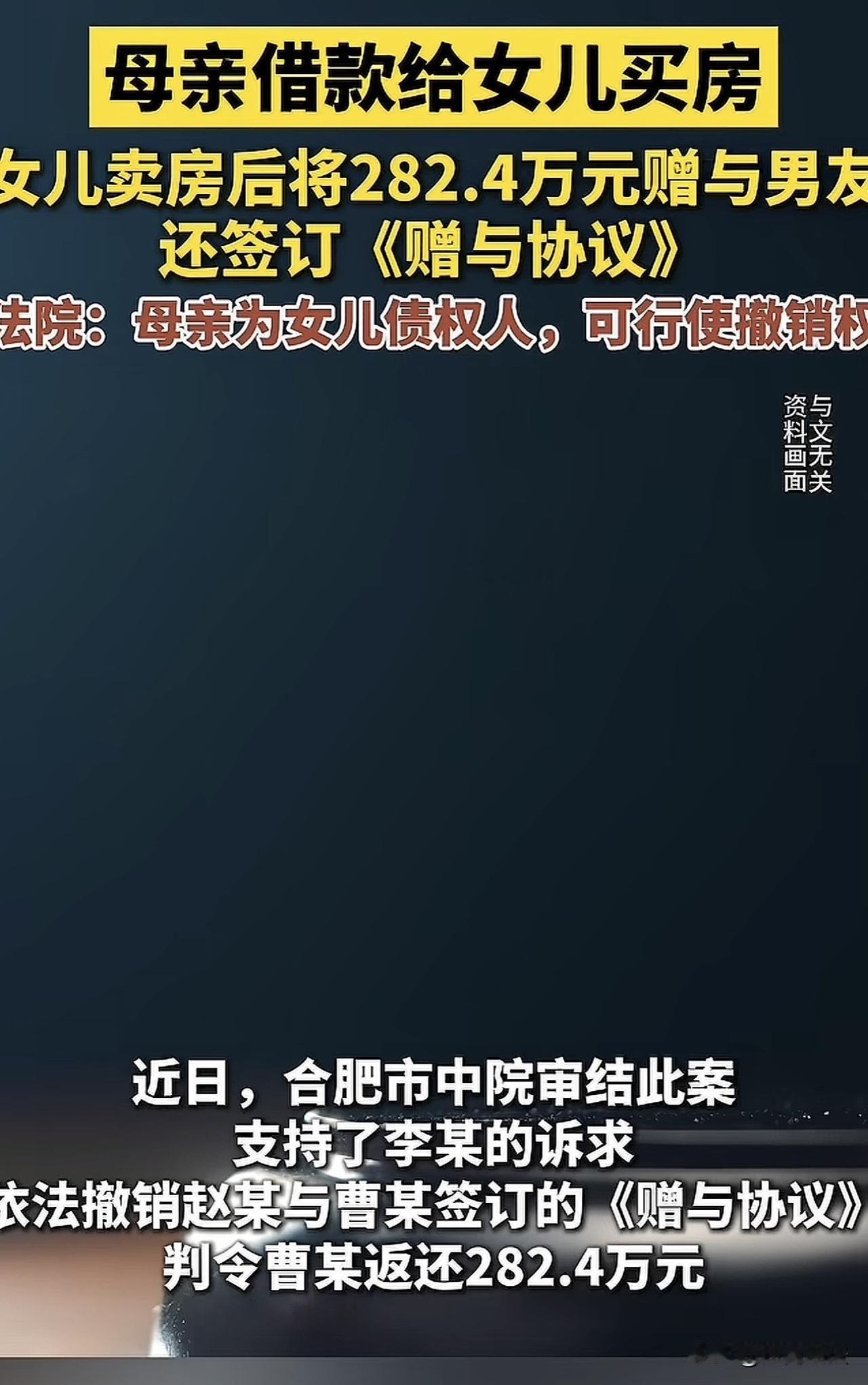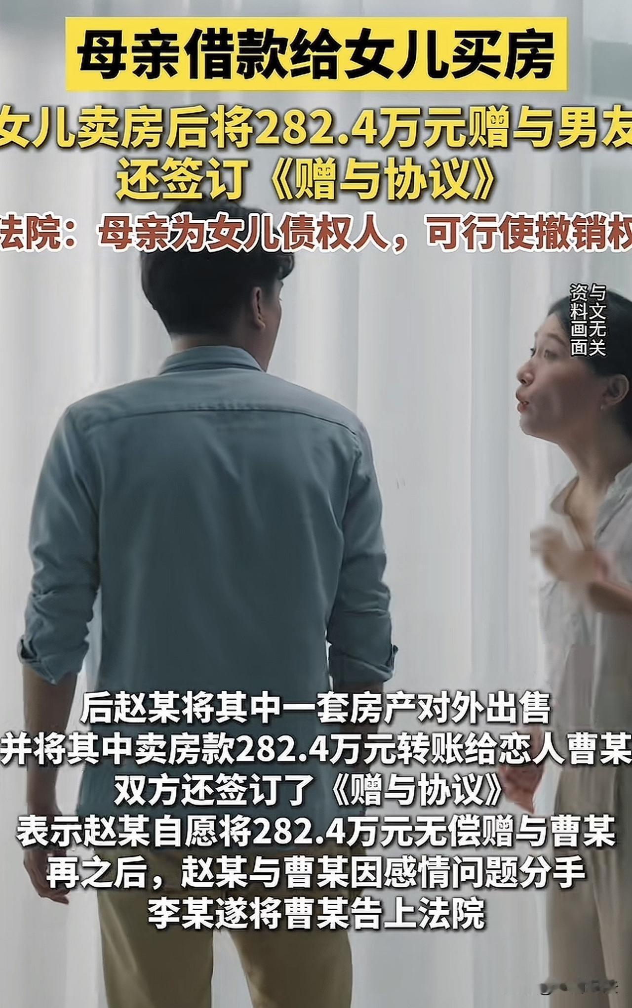 安徽,母亲花403万给女儿买房,岂料,恋爱脑女儿转手卖掉,给男友转了282万,还签了无偿赠与协议!可没过多久两人分手,男友却拒绝还钱,母亲一怒之下将男子告上法庭,竟用一奇招讨回了全部欠款! 2月3日,闽南网报道了一则奇特的财产纠纷案。 今年20多岁的赵小莉,家庭条件优越,。几年前,一次偶然的机会,赵小莉结识了男子曹建民,两人很快熟悉起来。 曹建民长相帅气,口齿伶俐,很会哄人开心,相处不久便讨得了赵小莉的欢心,两人正式确立了恋爱关系。 恋爱期间,赵小莉对曹建民十分上心,平时经常主动给曹建民买衣服、买礼物,日常开销也大多由赵小莉承担。 赵小莉的母亲十分疼爱女儿,几年前,特意在市区花费403万元,为赵小莉购置了两套房产,房产所有权人登记为赵小莉。 随着城市发展,这两套房产的市场价值不断攀升,相较于购买时已升值不少,成为赵小莉名下一笔可观的资产。 两人恋爱一段时间后,曹建民向赵小莉提出,自己打算创业做生意,前景十分可观,但目前缺少一部分启动资金,希望赵小莉能给予支持。 单纯的赵小莉没有丝毫怀疑,一心想要帮助男友实现创业梦想,当即表示愿意全力支持。 考虑到自己手头的现金不足以支撑男友的创业本金,赵小莉便盘算着卖掉母亲为自己购置的两套房产中的一套,用卖房所得的款项支持曹建民创业。 打定主意后,赵小莉很快联系了房产中介,着手办理房屋出售事宜,经过一番协商,最终将其中一套房产以282.4万元的价格卖出。 卖房款项到账后,赵小莉没有丝毫犹豫,第一时间将全部282.4万元转账给了曹建民,全力支持他创业。 然而,曹建民却暗中多留了一个心眼,在收到款项后,开始对赵小莉花言巧语,劝说赵小莉与自己签订一份无偿赠与协议。 起初,赵小莉有些不情愿,她觉得两人只是恋爱关系,签订这样的无偿赠与协议不太合适。 但曹建民始终软磨硬泡,不断劝说赵小莉,声称反正两人以后一定会结婚,成为一家人,签订这份协议只是走个形式,既能省去后续很多不必要的麻烦,也是对两人感情的一种考验。 架不住曹建民的反复劝说和甜言蜜语,单纯的赵小莉最终妥协,在没有告知母亲的情况下,签下了这份无偿赠与的《赠与协议》。 然而,现实并未如两人预期的那般美好。曹建民拿到款项后,投入到创业项目中,可由于缺乏经验、经营不善,生意很快便出现亏损,赔了不少钱。 与此同时,两人也开始因为生活琐事、生意亏损等问题频繁发生争吵,争吵的次数越来越多,矛盾也越来越深,曾经的甜蜜渐渐消失殆尽,最终两人都身心俱疲,决定结束这段恋爱关系。 分手后,赵小莉想到自己为曹建民付出的一切,尤其是那282.4万元的卖房钱,便找到曹建民,要求他归还当初转账的282.4万元。 让赵小莉没有想到的是,曹建民一口回绝了她的要求,还当场拿出了当初两人签订的无偿赠与协议,声称这笔钱是赵小莉自愿无偿赠与他的,如今两人已经分手,他没有义务归还。 母亲得知事情的来龙去脉后,又气又怒,将曹建民告上了法庭,要求其归还282.4万元款项。 庭审现场,曹建民手持那份无偿赠与协议,态度十分强硬,洋洋自得地认为自己手握关键证据,一定能胜诉,稳操胜券。 可就在此时,赵小莉的母亲突然拿出了一张借条,借条明确显示,几年前为赵小莉购置两套房产所花费的403万元,并非她无偿出资,而是她借钱给女儿购买的,赵小莉对该笔借款负有偿还义务。 那么,从法律的角度该如何看待此事呢? 1、 赵小莉与曹建民《赠与协议》是否有法律效力? 根据《民法典》第六百五十七条规定:赠与合同是赠与人将自己的财产无偿给予受赠人,受赠人表示接受赠与的合同。 赵小莉与曹建民签订书面《赠与协议》,且赵小莉已实际转账 282.4 万元,曹建民接受,赠与合同成立并生效,财产权利已完成转移。 也就是说,赠与协议已经生效,具备法律效力,正常情况下,赵小莉是无法要求曹建民归还的。 2、 赵小莉母亲是否有权要求曹建民归还购房款呢? 母亲持有赵小莉出具的借条,证明 403 万元购房款为借款,而非赠与,母亲对赵小莉享有合法债权,且该债权形成时间早于赵小莉对曹建民的赠与行为。 根据《民法典》第五百四十二条规定:债务人影响债权人的债权实现的行为被撤销的,自始没有法律约束力。 赵小莉作为债务人,无偿转让 282.4 万元售房款给曹建民,属于无偿处分财产权益; 该行为导致赵小莉责任财产减少,影响母亲 403 万元债权的实现,曹建民因该赠与取得的 282.4 万元构成不当得利,应全额返还。 3、 法院该如何审理呢? 法院经审理认为,赵小莉与曹建民的《赠与协议》虽成立生效,但因赵小莉无偿处分财产损害母亲债权,母亲可行使债权人撤销权,撤销该赠与行为。 因此,法院判决曹建民应返还赵小莉母亲这282.4 万。 对于此案,你怎么看? (文中人物均为化名)