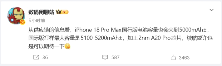 直播吧02月06日讯博主@数码闲聊站今天在微博表示,从供应链信息来看,苹果iPhone18ProMax国行版电池容量将达到5000mAh±。