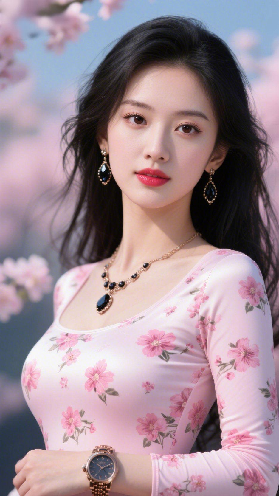 《粉裙栖樱光》 樱花漫染的春日里,粉底碎花裙晕开软甜的柔,裙间花影与枝头樱瓣轻叠,像把整个春天的粉都揉进了衣摆。长发微卷随春风轻扬,耳坠的细闪衬着颈间的柔,添了几分恰好的雅致。 她眉眼澄澈,唇色明润如樱,静静立在花影里,眼神裹着春日的缱绻——不张扬,不刻意,像从软风里浸出来的画,把浪漫都藏进了轻晃的裙摆。 这样的温柔,是春日最妥帖的底色:不喧嚣,不浮躁,只留满衣花香与干净的好,让时光都慢成了软甜的模样。 粉裙樱光感 春日软甜