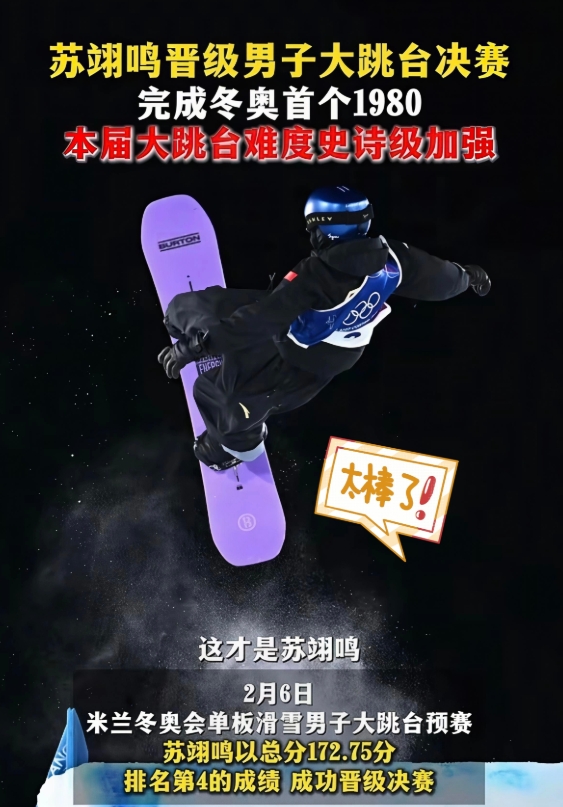 谁懂啊家人们!米兰冬奥单板大跳台预赛,苏翊鸣首跳直接摔了,22分排第24,我当时心都凉了半截,以为要凉了… 万万没想到这帅小伙,第二跳直接干到87.75分,第三跳又整了个1980度高难度,最后总分172.75,从第24逆袭到第4,硬生生把自己从淘汰边缘拽进了决赛!这惊天逆转真的太牛了! 赛后他说“我还是很开心能够战胜自己”,真的破防了。这才是体育最动人的地方,不是永远赢,而是摔了还能爬起来,把绝境走成坦途。 决赛继续冲!小苏好样的,看好你,继续加油!
