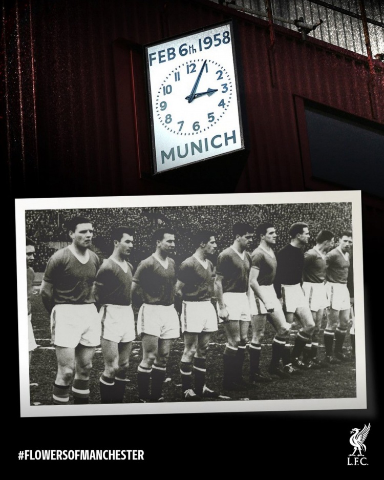 慕尼黑空难68周年,利物浦社媒发文:停下脚步,与曼联同心追思