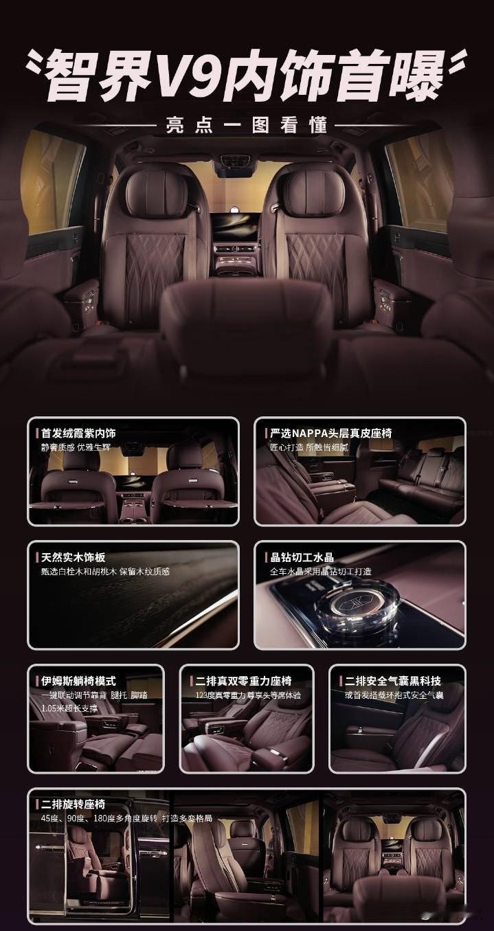 余承东邀请你在智界V9里喝茶、下棋、聊天,表示新车将配备二排旋转座椅,首发绒霞紫内饰。官方图显示,智界V9将配备二排真双零重力座椅,支持伊姆斯躺躺椅模式。同时,配备二排安全气囊黑科技,首发搭载环抱式安全气囊,提升后排被动安全性能。 智界V9是鸿蒙智行旗下首款旗舰MPV,预计今年春季上市,主打50万元级高端市场。动力方面将提供增程和纯电版本,增程版CLTC综合续航最高超1250公里,纯电版基于800V高压平台打造。