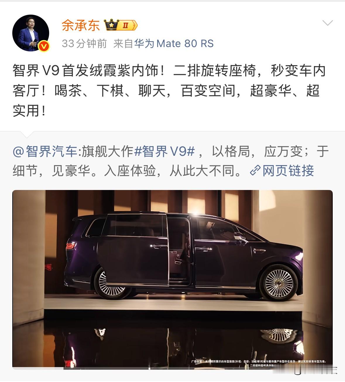 余承东邀请你在智界V9里喝茶、下棋、聊天,表示新车将配备二排旋转座椅...