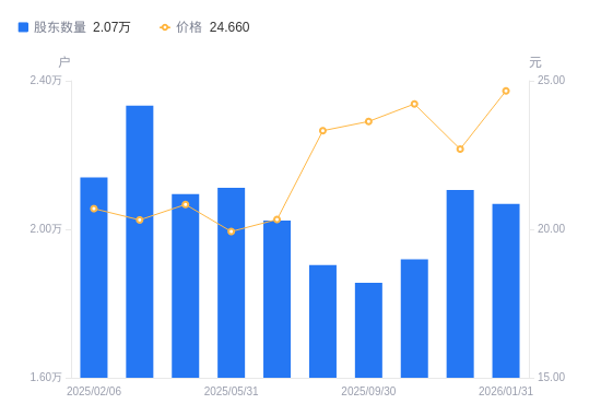 近一年(2025年2月6日至2026年1月31日),川仪股份A股股东户数从2.14万户,减低至2.07万户,降幅3.35%,区间股价上涨21.81%。