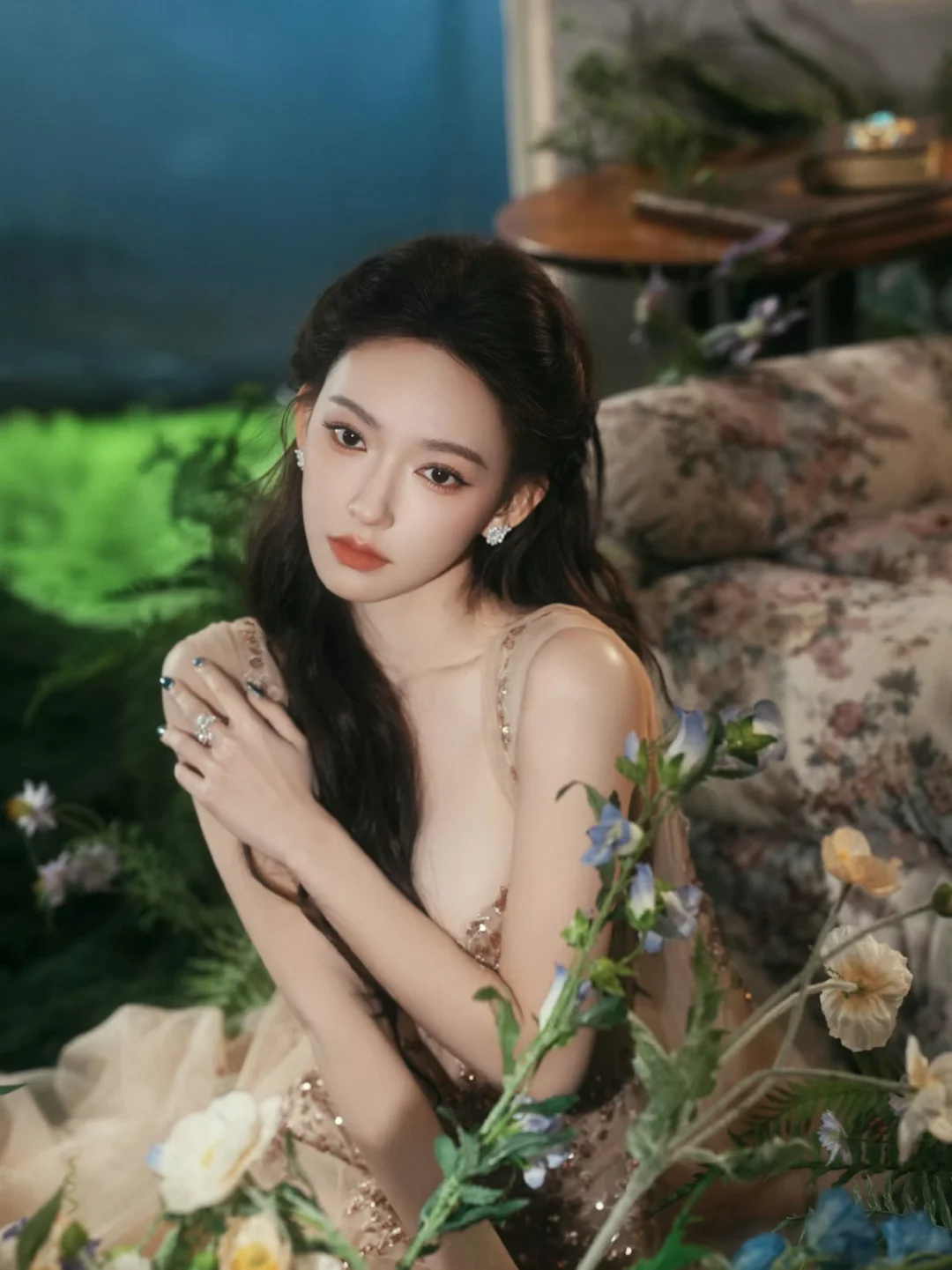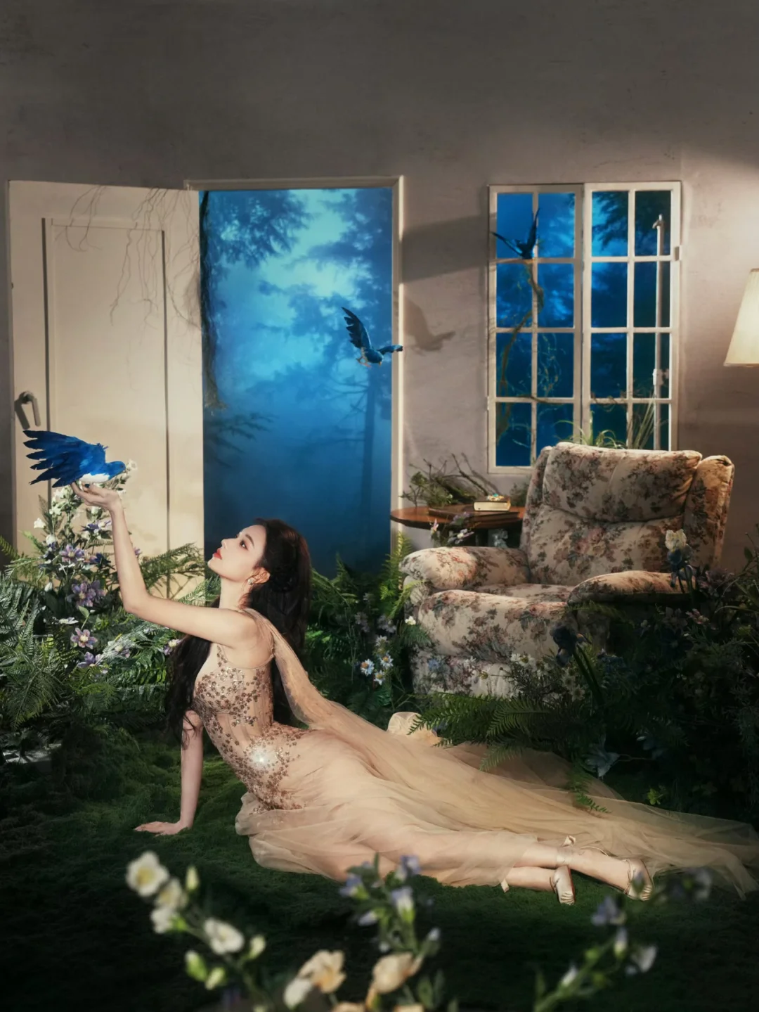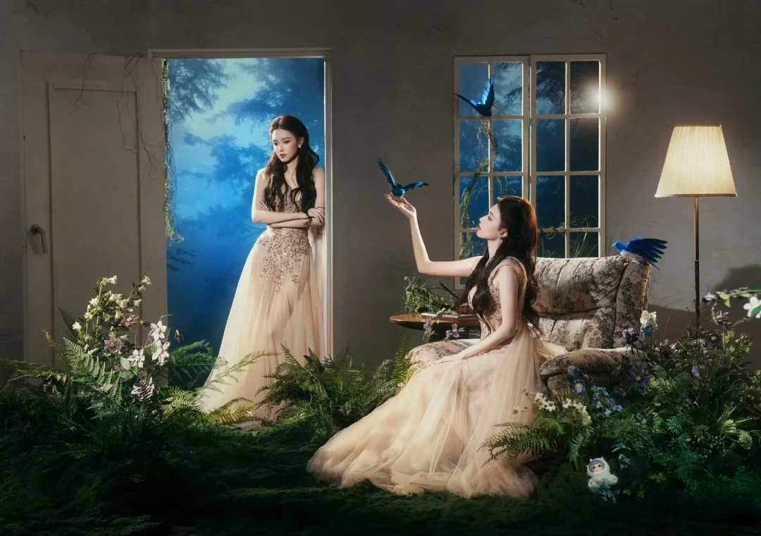 📷童话风写真棚拍置景参考 程潇的出发图置景也是很惊艳。在室内精心搭建了一个场景,营造出了魔法森林奇幻小屋的即视感。地面铺了仿真草皮,点缀了植物和野花,还悬挂了几只蓝色小鸟道具增添灵动感,就像是个秘密花园。同时复古碎花沙发、茶几和落地灯等软装,又为这个魔法空间注入了温暖的感觉。 摄影师:岛屿何何