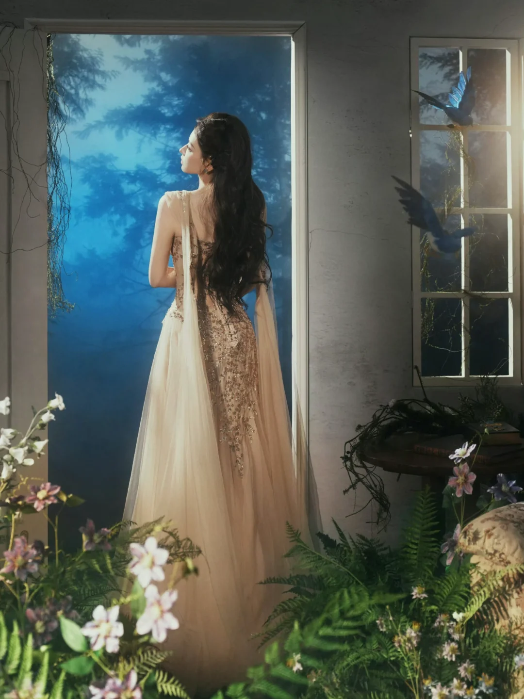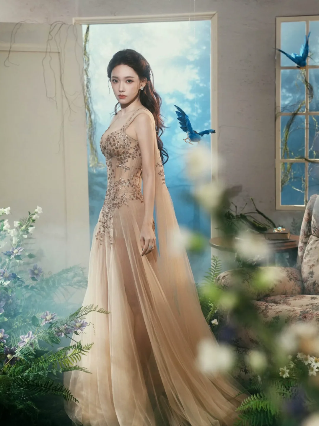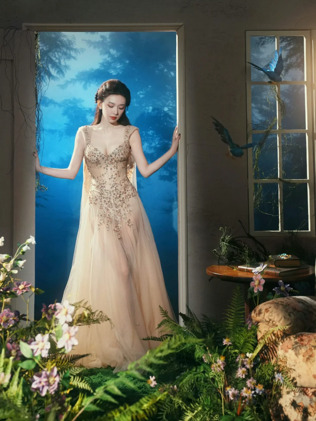 📷童话风写真棚拍置景参考 程潇的出发图置景也是很惊艳。在室内精心搭建了一个场景,营造出了魔法森林奇幻小屋的即视感。地面铺了仿真草皮,点缀了植物和野花,还悬挂了几只蓝色小鸟道具增添灵动感,就像是个秘密花园。同时复古碎花沙发、茶几和落地灯等软装,又为这个魔法空间注入了温暖的感觉。 摄影师:岛屿何何