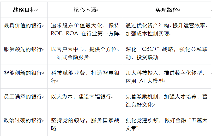 企业愿景:建设"智慧化、特色化、国际化、综合化"的服务领先银行。"四化"愿景相互关联:智慧化是手段,通过科技赋能提升服务效率;特色化是路径,通过差异化竞争打造核心优势;国际化是方向,通过全球布局提升影响力;综合化是目标,通过全牌照经营满足客户综合需求。