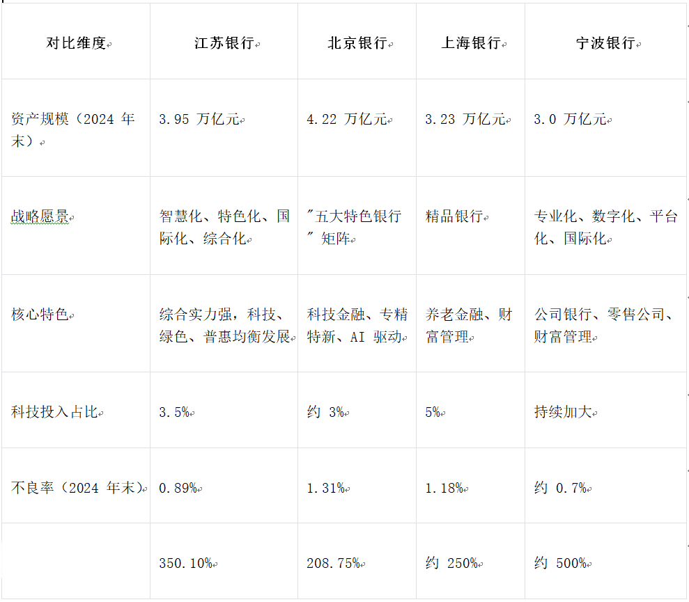 为全面了解江苏银行的战略定位和竞争优势,我们选取北京银行、上海银行、宁波银行等同类型城商行进行对比分析: