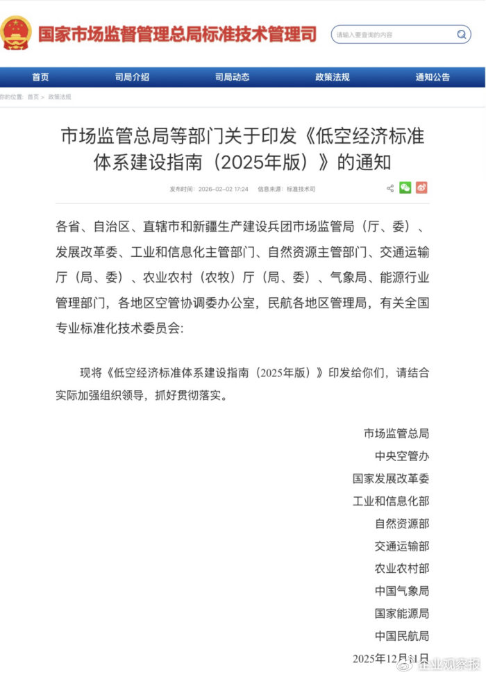 市场监管总局近日会同中央空管办、国家发展改革委等十部门,正式发布《低空经济标准体系建设指南(2025年版)》(下称《建设指南》)。