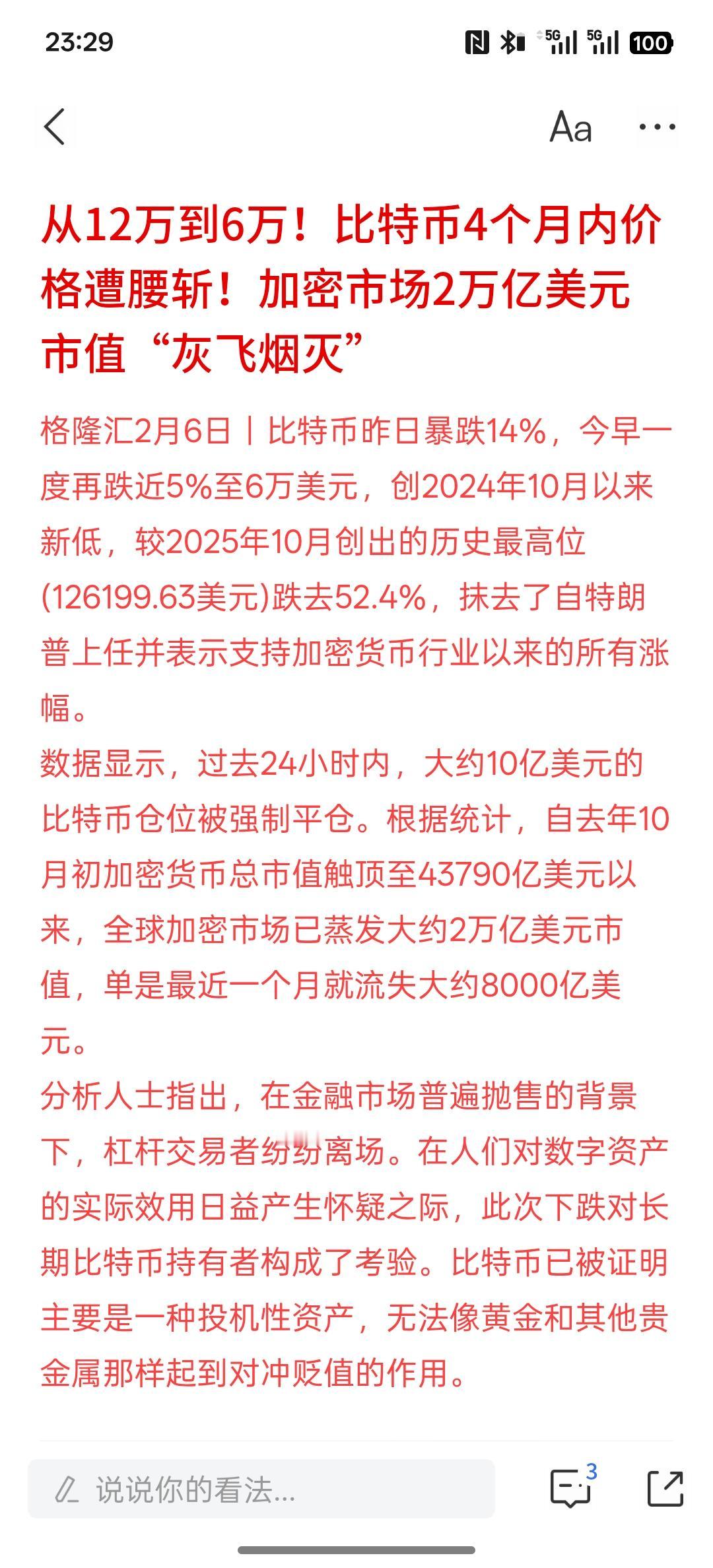 比特币大幅下跌,从12万到6万!比特币4个月内价格遭腰斩!加密市场2万亿美元市值“灰飞烟灭”,虚拟币开始大幅的下跌!虚拟货币它就是一个数字,没信用体系的背书只是资本的炒作!这种虚拟货币能走多远?一旦资本撤离的话,就犹如高楼根基不稳,很容易出现塌方式的下跌!中国一直在禁止这种虚拟货币进行交易,甚至禁止挖矿