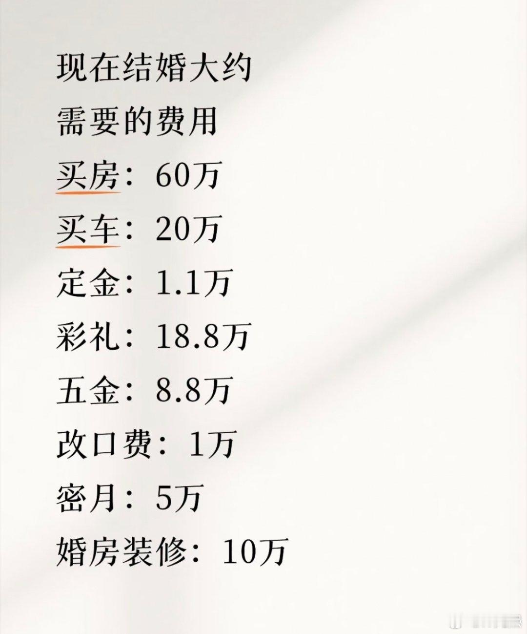 有网友算了一笔账,从基础的彩礼、五金,到婚房,再到代步车、婚礼酒席....各项加起来,普通家庭结婚男方至少要准备120万。