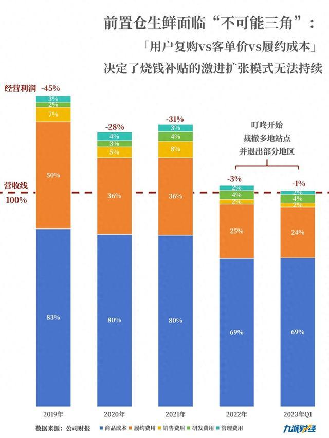 为保证即时送达且覆盖更大的消费群体,需要铺设大量前置仓及储备生鲜产品,这意味着履约及商品损耗成本高,要求足够高的客单价或订单量来覆盖,但高价又与用户规模互斥。