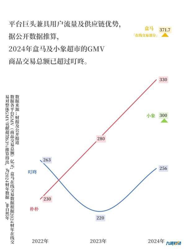 互联网平台生态具有天然的低获客成本及履约成本的优势,盒马接入淘宝闪购入口后,线上订单量快速突破200万单,同比增长超70%;小象超市依托美团供应链及配送网络,每单履约成本控制在4~5元。截至2024年,两家商品交易总额(GMV)均已远超叮咚买菜。