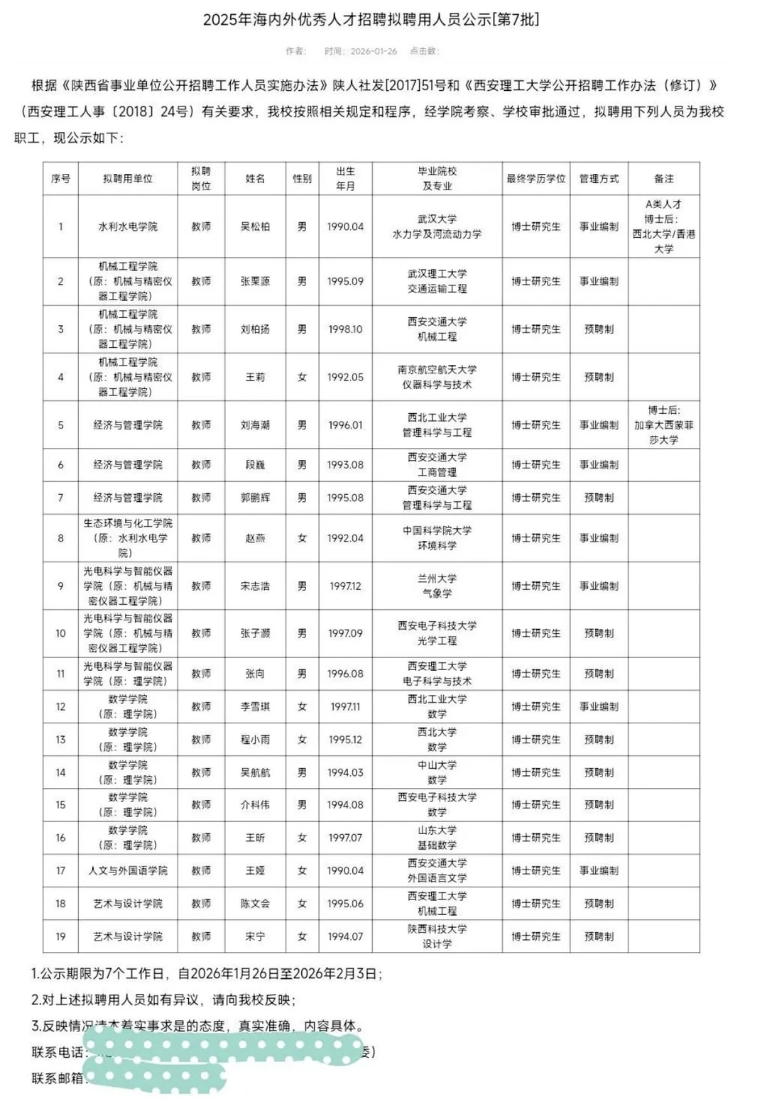西安理工大学拟聘19人公示:95 后博士成主流