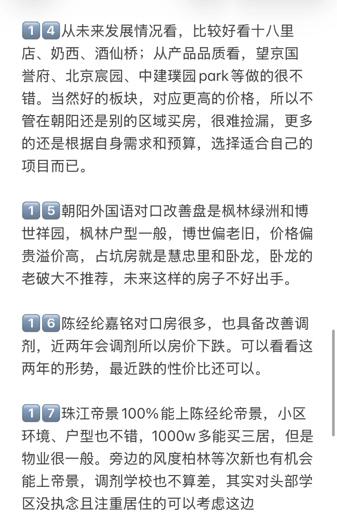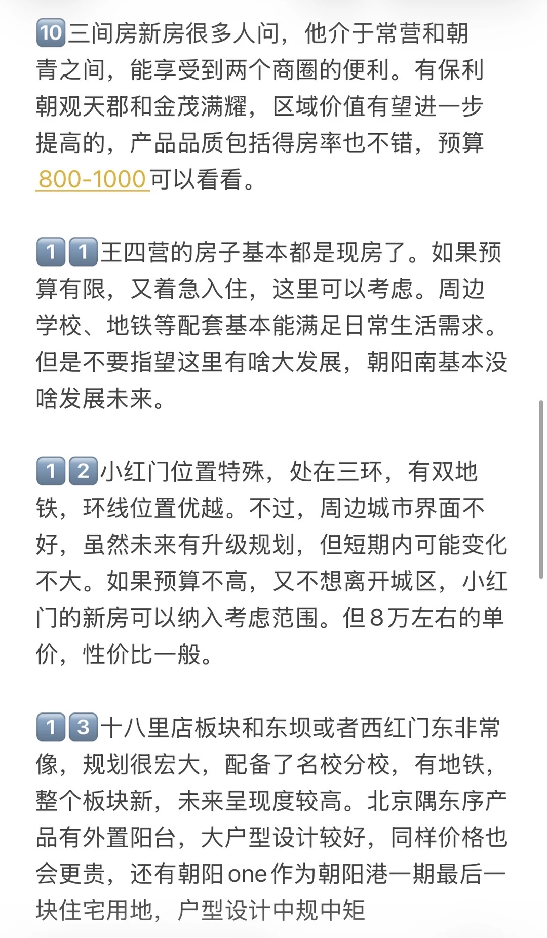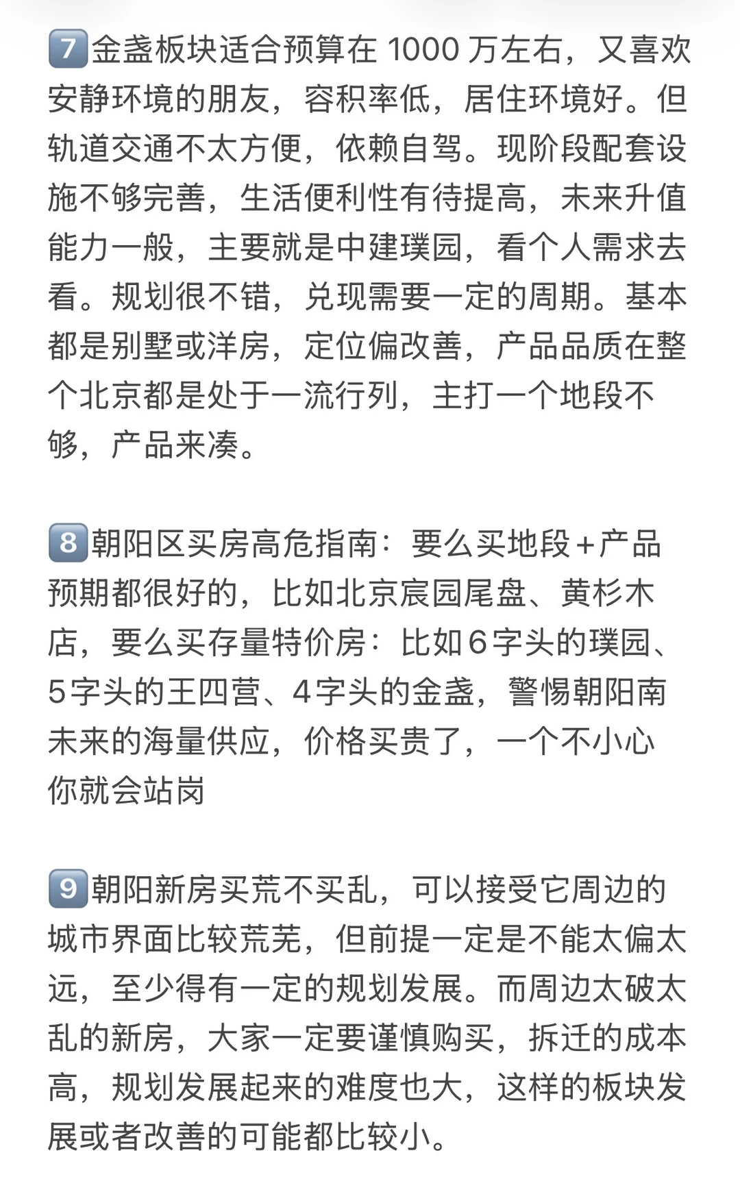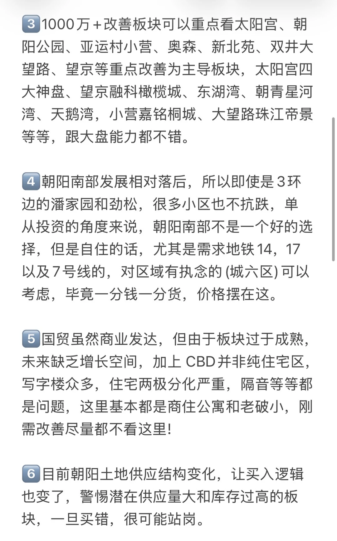 1️⃣朝阳选房时,地段的未来发展潜力重点关注。不能光听一些没影的规划,得看实实在在能落地的项目。并且已经开始动工,那这样的地段就很有潜力,朝阳好板块望京、亚运村、东坝、朝青等等