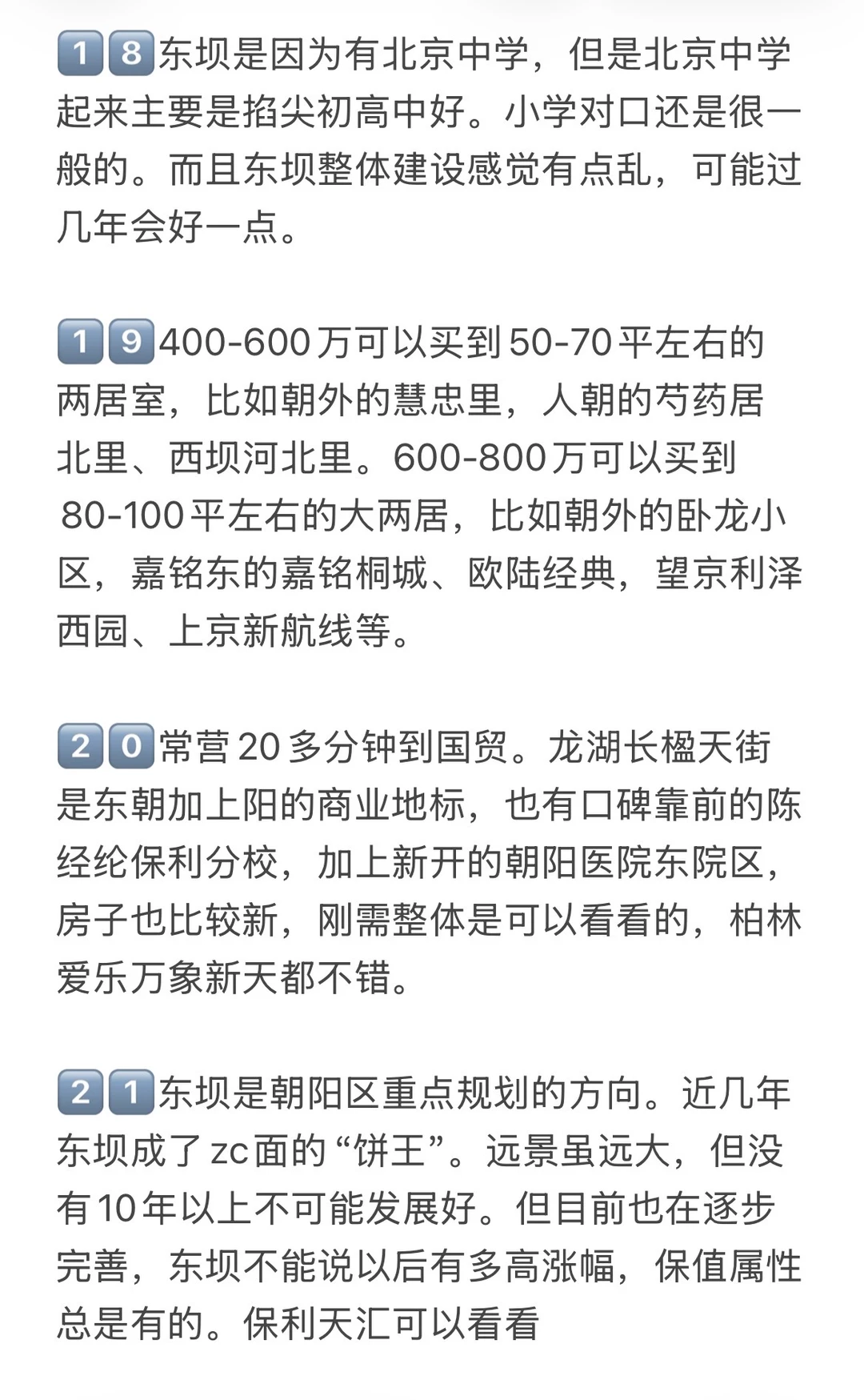2️⃣朝阳刚需400多买房对学区需求不大可以看看东坝、常营、四惠、百子湾、老北苑等板块,交通通达度不错,能看的房子也不会特别老,北京新天地,柏林爱乐、保利嘉园、富力阳光美园、金隅汇星苑、金隅泰和园、北苑家园茉藜园、望春园、壹线国际等小区都可以看
