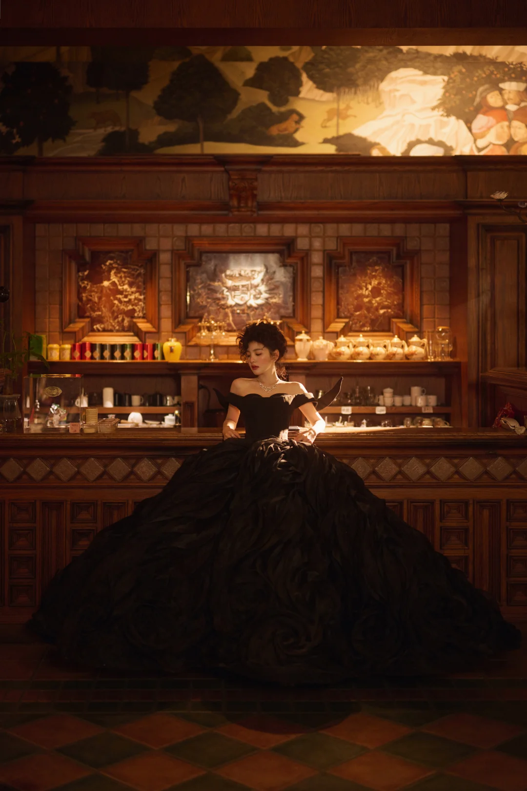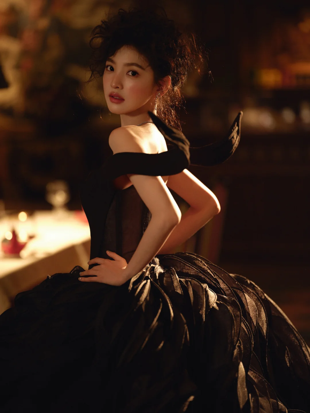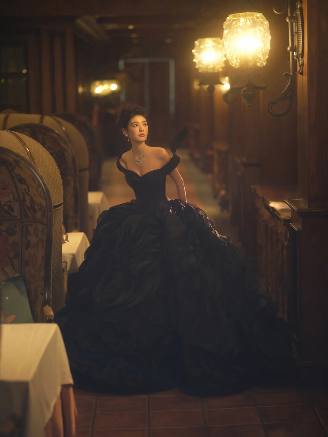 📷欧式复古风拍照参考 这次微博之夜的出发图好多都是走的欧式复古风,章若楠的这组也很惊艳。造型上选择黑色抹胸超大摆礼服,呈现欧式古典风格。拍摄地选在北京“东方红酒窖”餐厅,复古的摆设和暖黄的光影,仿佛将她带入中世纪古堡的故事场景,就像一位悄然出逃的暗黑公主。妆容上也很独特,大面积扫了粉雾腮红,让整体氛围多了一层柔媚的浪漫底色。 图片来源:章若楠工作室