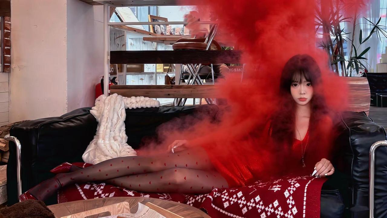 红裙裹着柔暖光暗调背景里,她立于光影间,像一捧暖透的绯云落定。正红裙