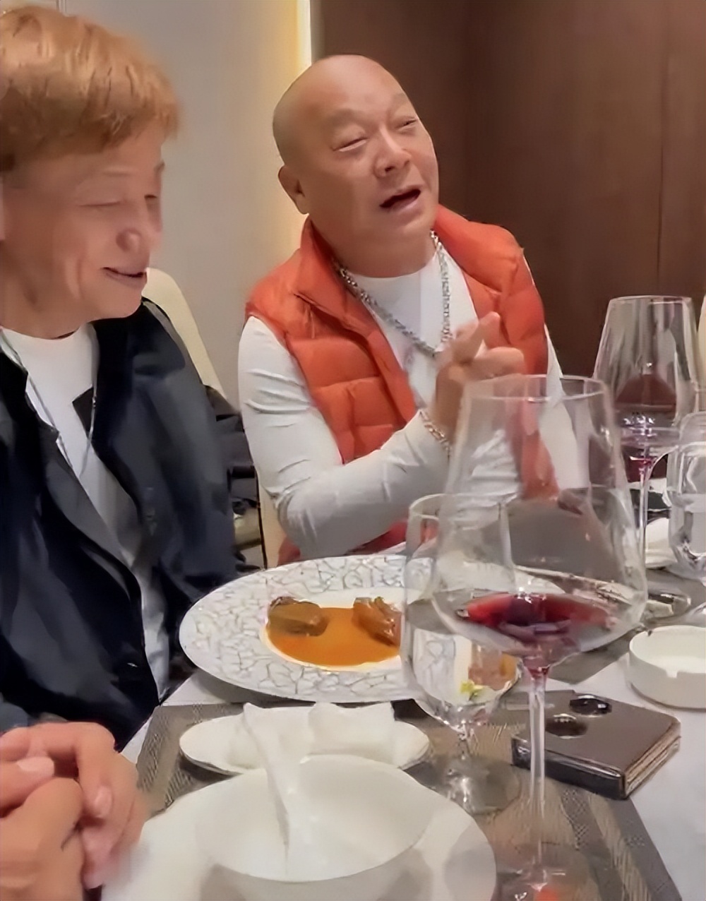 饭桌上梁小龙还跟朋友们说起最近的生活安排,聊得兴起时还比划了几个招式,引得大家哈哈大笑。