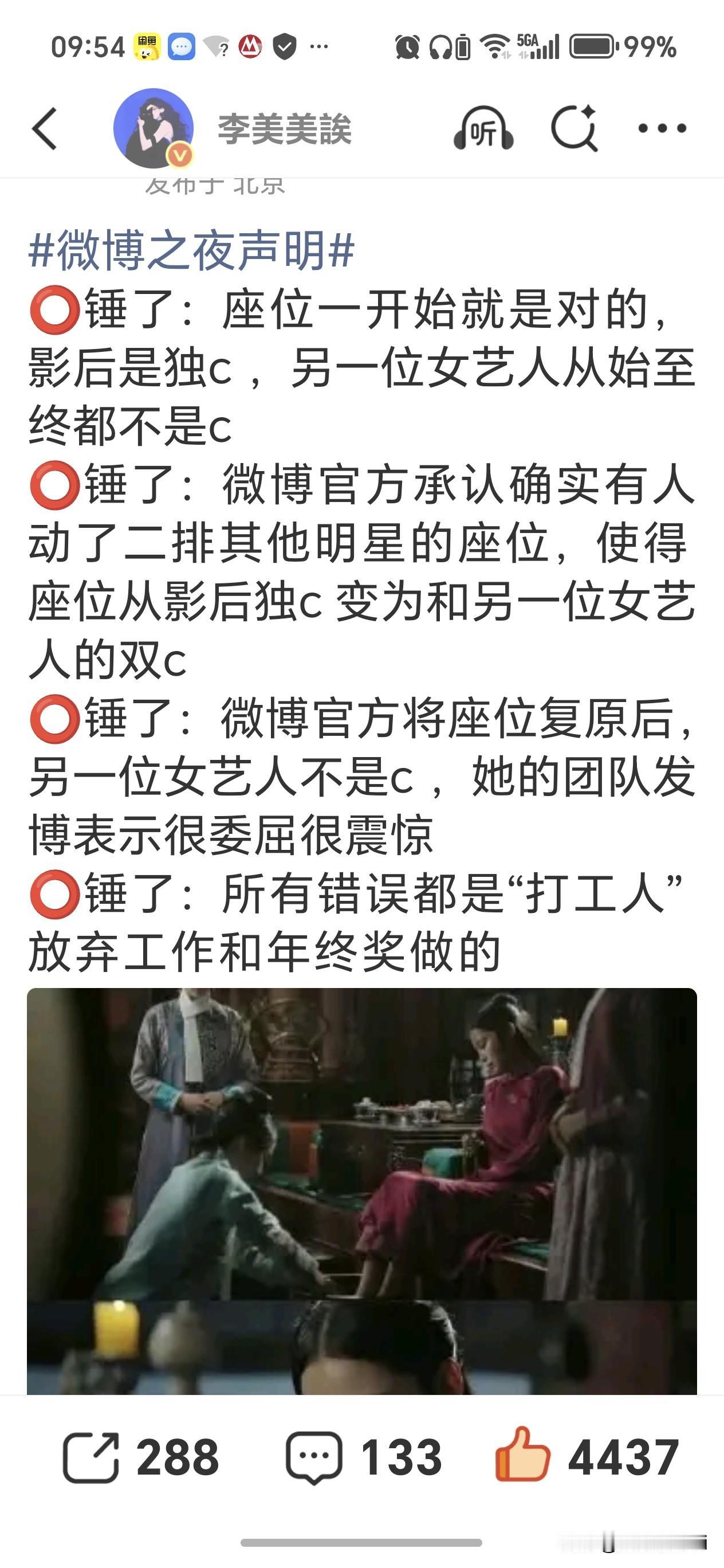 明星参加重要活动,走红毯顺序和座位号都是平台和明星签好合约的,明星才会确定出席与否。入场后座位号被撕被换,完全可以当场拒绝出席,肖战已经很体面了,也是为了粉丝能看见他,坚持站到最后参加了领奖活动才离开。不管是不是杨性女星撕掉肖战的座位名牌,平台肯定包庇撕名牌肇事人了,用工资人员失误顶锅太过牵强。平台毁约在先,肖战根本可以直接走人,,不过那样平台和女星可就更加被动了,所以微博给肖战再三公开道歉理所当然,女星粉丝也赶紧闭嘴 还好意思造谣辱骂肖战,肖战已经给了你们姐姐最大的体面。