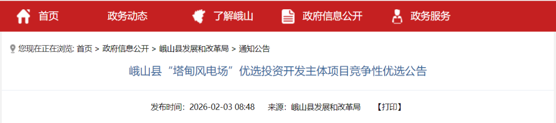 风芒能源获悉,2月3日,云南玉溪市峨山彝族自治县发展和改革局发布《峨山县“塔甸风电场”优选投资开发主体项目竞争性优选公告》。