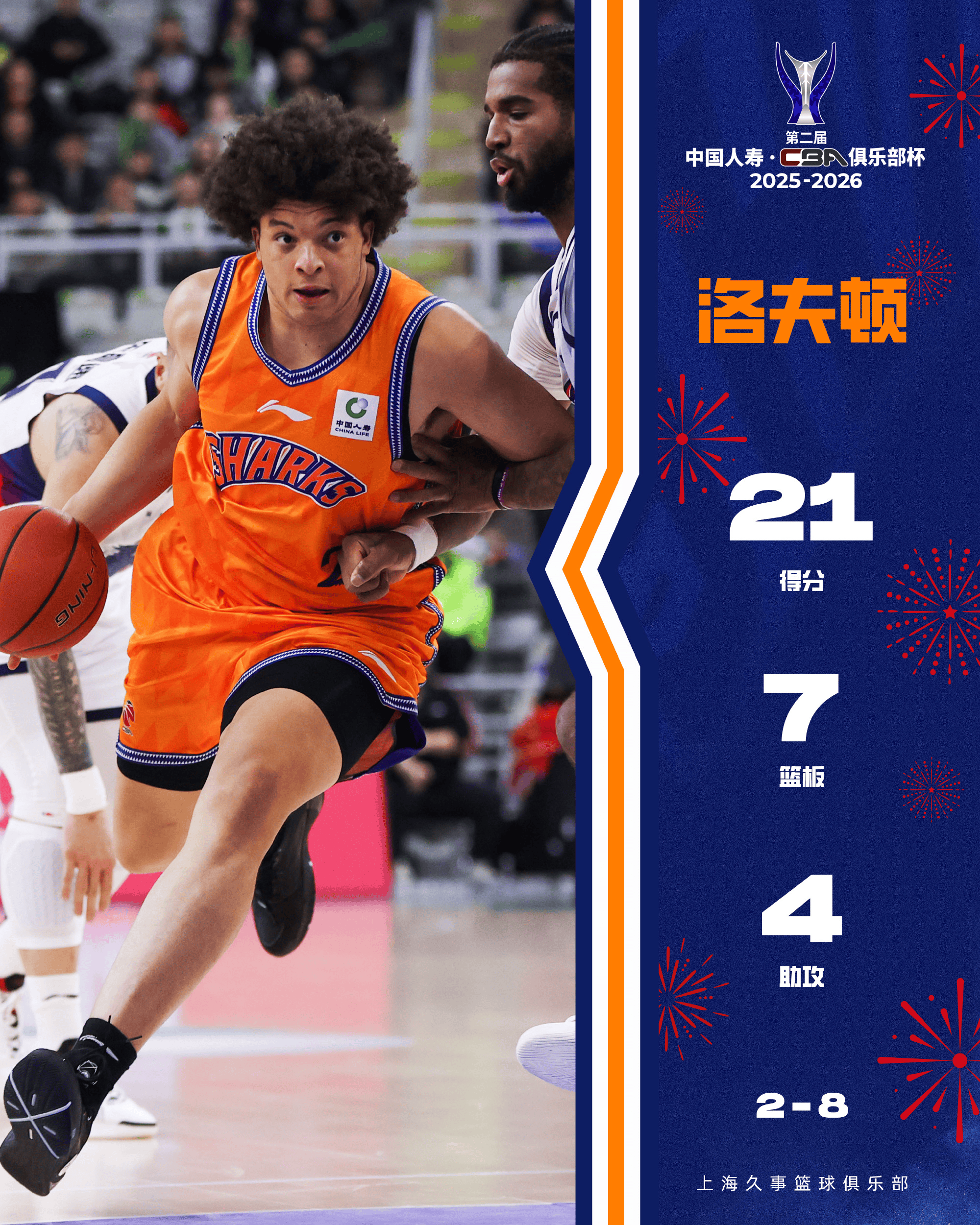 配文:2月8日晚,在上海久事对阵山东高速的俱乐部杯半决赛中,洛夫顿出战22分27秒,11投6中,三分7投4中,得到21分7篮板4助攻2抢断的全面数据,掌声送给洛夫顿!肯尼,模子!决赛加油!