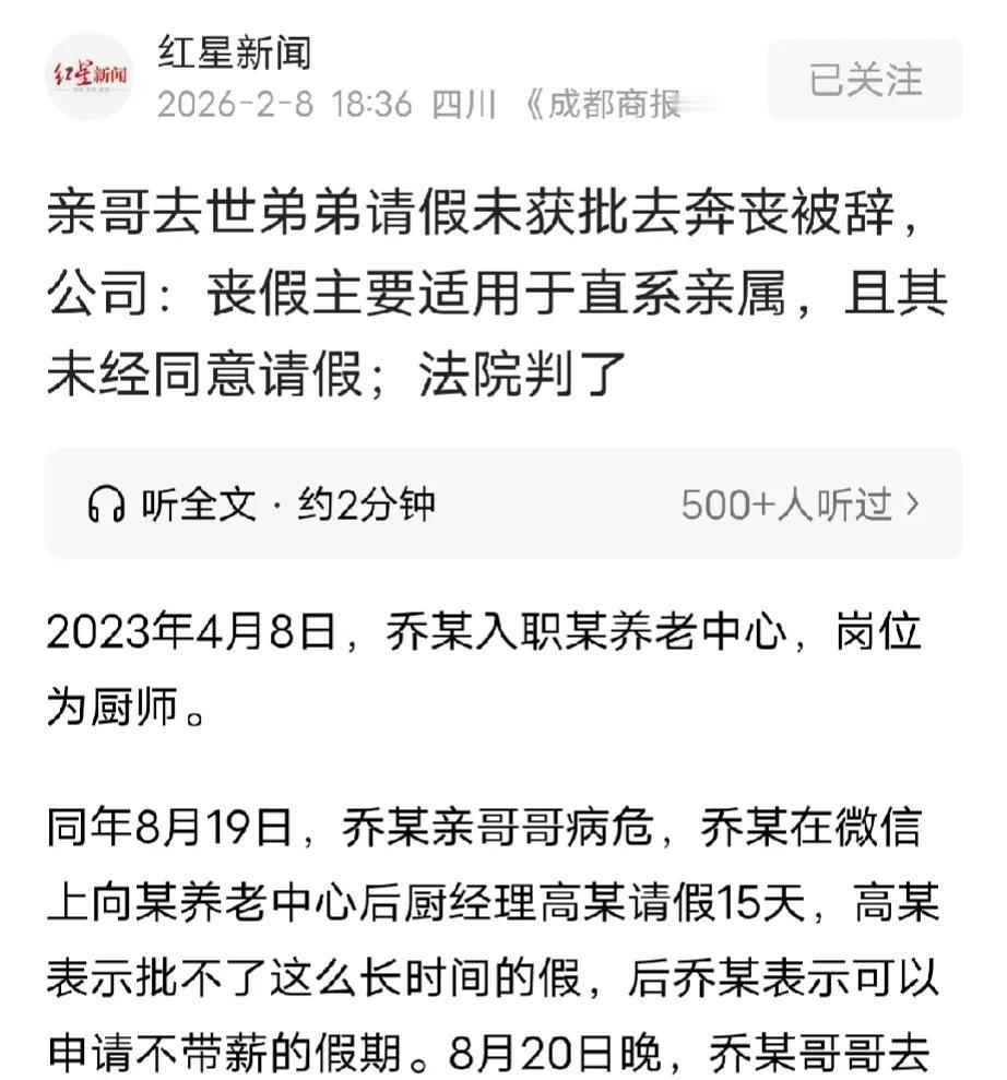 北京,男子的哥哥去世,他发信息给经理请假回去奔丧,经理没吭声,谁料,5天后男子回去上班,经理告诉他,他被辞退了,男子不服告上法庭,认为公司这是违法解除劳动合同,要求赔偿,没想到,公司以“哥哥不是直系亲属,不适用丧假”为由,拒绝赔偿,最终,法院判了。 2025年8月19日,乔某接到家人电话,说他的哥哥病得很严重,在医院抢救。 乔某得知这个消息着急不已,恨不得当时就飞回去看望哥哥,可他远在北京,再怎么急也没办法。 不过,他打算第二天就请假回去看看哥哥,所以,当晚他发信息给经理说,他要请15天假回去照顾哥哥。 经理回复他说,自己没办法批他那么长的假。 乔某表示,他可以申请不带薪的假期,可经理还是没答应他,不过他也没表示反对。 因为得不到经理的批准,第二天乔某还是去上班了。 谁料,20号下午乔某刚刚下班,就接到家人电话说,他的哥哥已经过世了。 乔某听了伤心不已,他急急忙忙收拾东西,往火车站赶,因为公司离火车站比较远,当晚他就乘车到火车站附近住下,打算第二天乘坐最早的火车。 在乔某赶去火车站的路上,他又给经理发信息说,经理我原本打算明天再上一天班,现在来不及了,我明早就回老家了,所以跟你请假。 经理收到信息后,还是没有任何回复,不说拒绝,也没有说答应。 乔某知道经理不高兴,但为了回去送哥哥最后一程,他顾不了那么多了。 24号办完哥哥的后事,为了保住工作,乔某还是买了第二天返程的车票。 25号,在坐车回北京的路上,乔某给经理发信息说,经理我已经在赶回来的路了,明天我就可以上班。 谁料,经理回复他说,你下周一找我,写辞职信,明天不用进公司。” 乔某以为经理那是在气头上,随口说说来吓唬他。 没想到,8月28号,公司给乔某发来信息说,乔某21号请假时没得到主管批准、也没有做好交接工作,另外哥哥不是他的直系亲属,经公司决定辞退乔某。 乔某不服申请劳动仲裁,但没成功,他气不过起诉到法院,认为公司那是违法解除劳动合同,要求赔偿。 法院经过审理认为,开除员工是最严厉的处罚,不能随意而为之。乔某因亲哥去世请无薪事假奔丧,公司不准假还以此为由将其开除,这种做法违背了公序良俗。 最终,判决该公司应向乔某支付违法解除劳动合同赔偿金7000余元。 那可是他亲哥,这公司也太冷血了! 员工亲哥离世是天大的急事,主动提无薪假还全程报备,经理装聋作哑不回复,转头就以非直系亲属、未批假为由辞退,简直把制度当冷漠的挡箭牌! 连基本的人情世故都没有,只认规则不讲良心,这样的企业谁还敢干?法院判得太对了,就该治治这种毫无人文关怀的公司! 根据《民法典》第8条规定,民事主体从事民事活动,不得违反法律,不得违背公序良俗。 这是民法的守法与公序良俗原则,也是民事活动的基本准则。 乔某为奔亲哥丧事请假,在经理无明确答复的情况下离岗,本是人之常情、事出有因,他不仅主动提出无薪休假,还在办完后事第一时间返程,足见其对工作的重视。 反观公司,面对员工的突发家事毫无人文关怀,既未合理沟通协商假期,又以“非直系亲属”为由机械拒假。 更在员工返程后直接辞退,将制度凌驾于公序良俗之上,寒了员工的心,也失了企业该有的温度。 法院的判决既维护了劳动者合法权益,更守住了人情底线。 这件事也警醒所有企业:制度之外,更要有人情,不能让员工在亲情与工作间做两难选择。
