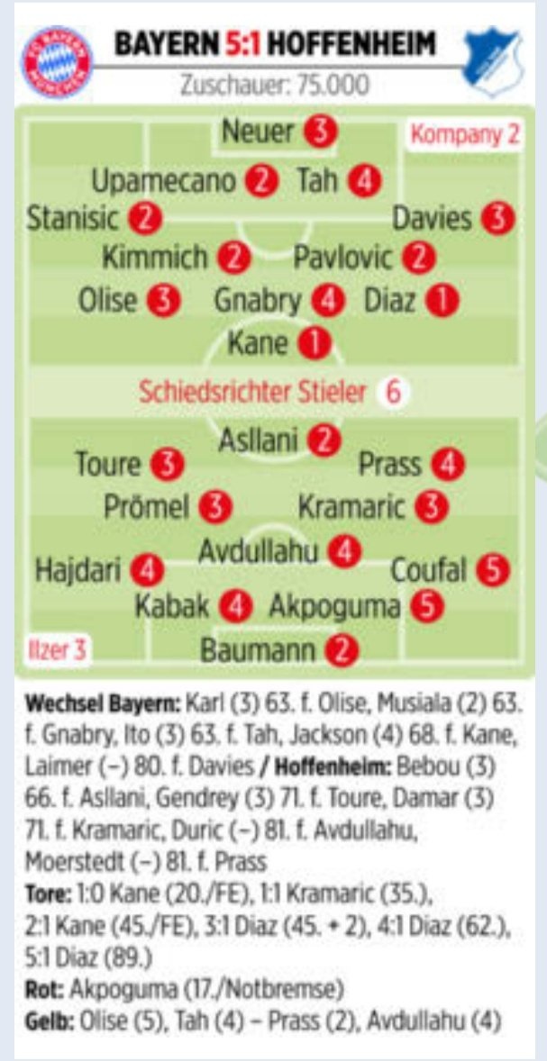 直播吧2月9日讯德甲第21轮比赛,拜仁主场5-1击败霍芬海姆,德国媒体《图片报》对两队球员进行了评分。