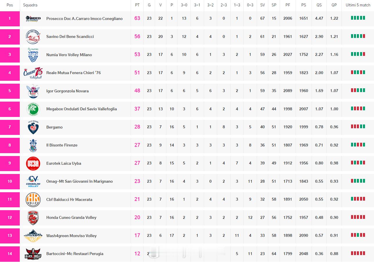【意甲女排最新积分榜:科内扩大领先优势 首支降级队呼之欲出】国际排坛战报速递中国排球留洋动态 2月8日,意甲女排第23轮战罢。科内利亚诺22胜1负63分继续领跑,并且将领先优势扩大为7分;第二集团斯坎迪奇、米兰、基耶里和诺瓦拉之间分差都在两三分内;圣乔瓦尼在四连胜后以7胜16分23分排名第10;垫底的佩鲁贾仅12分距降级一步之遥;另一支降级队仍有悬念。