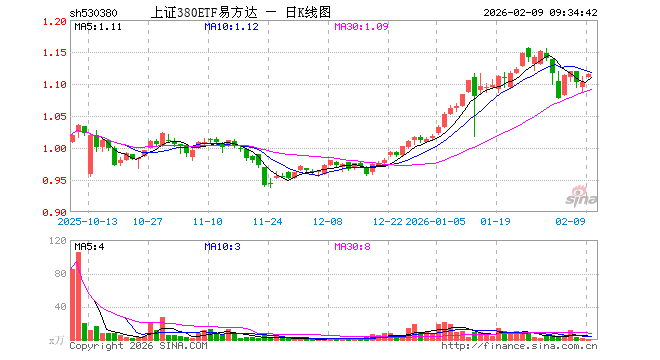 2月9日,上证380ETF易方达(530380)开盘涨0.73%,报1.110元。上证380ETF易方达(530380)重仓股方面,中国卫星开盘涨1.92%,航天电子涨2.65%,卧龙电驱涨1.51%,赤峰黄金涨2.40%,芯原股份涨4.33%,亨通光电涨3.73%,西部矿业涨2.09%,厦门钨业涨2.50%,云天化涨1.26%,赛轮轮胎涨0.67%。