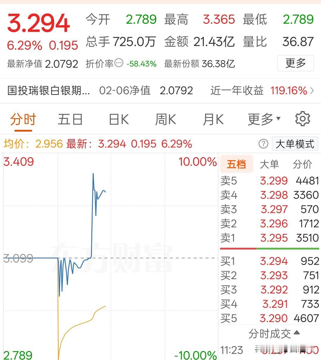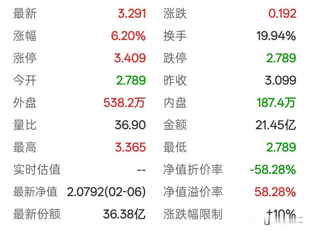 国投白银LOF基金,珍惜主力给出的机会吧,价格终究会回归到价值附近。 国投白银LOF基金经过周末信息的发酵,今日上午开盘终于为大家提供了出逃的机会。 它以跌停价开盘,随后迅速拉升,最高涨幅超8%,成交量异常放大,一上午的成交量就超过了20%。 它今日开板,一方面是主力自救,另一方面是换一批人来套。 它已经连续五个一字板跌停,理论上来说,融资和配资基本已爆仓。若再不放人出来,时间越久,此次事件带来的影响就会越严重,被清算的可能性也越大,基金自身也有所忌惮。 要是换一批人入场被套,就与基金本身关系不大了。 截至收盘,基金的溢价率达到了58%,这风险可不小。按照之前的对照情况,即便白银突破120,其当前价格也难以回归到价值附近,而价格与价值最终是会趋于匹配的。 短期远离!远离!即便再看好白银后市,大家也需等到其溢价率降至10%以内,待风险彻底释放。