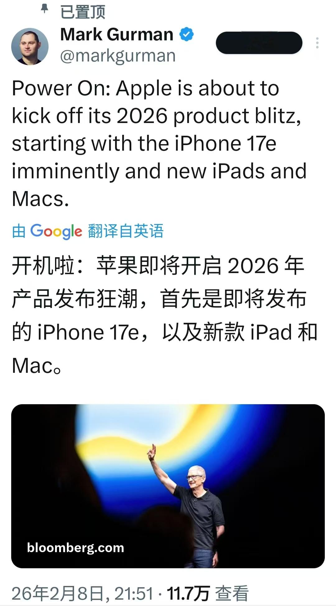 2月8日晚间,科技记者马克·古尔曼(MarkGurman)表示,苹果公司未来几周将推出一系列新产品,包括iPhone17e、新款iPad,以及搭载M5Pro/Max芯片的MacBook等。
