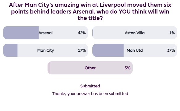 英超第25轮全部战罢,最后一场曼城2-1击败利物浦。英超官方随后发起投票,让球迷票选本赛季英超谁将夺冠。