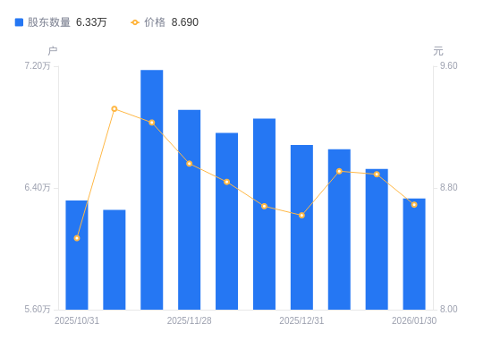 日期A股户数(户)流通A股户均持股数(股)户均持股市值(万元)2026-01-306330822035.0719.152026-01-206524821379.9119.012026-01-096654920961.9418.682025-12-316682220876.3018.002025-12-196856220346.4917.662025-12-106762520628.4118.242025-11-286913220178.7418.082025-11-207174319444.3517.952025-11-106255222301.3920.782025-10-316317522081.4618.70