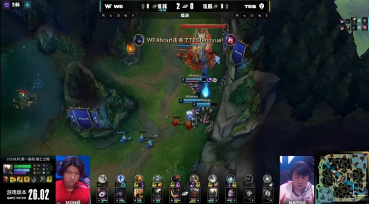 [8:14]WE拿下第一条小龙!naiyou潘森包下但是飞的角度不太好,抓不到人啊!随后Monki还能帮助队伍再拿一虫!