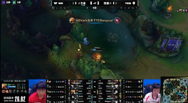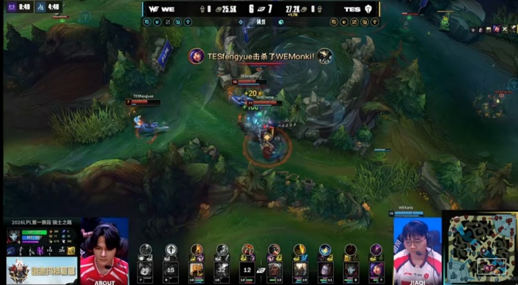 [21:25]中路Karis沙皇先手出击推回naiyou潘森,TES四人在位还想反打,结果WE双C实在很能打啊!残局About厄斐琉斯关键清辉夜凝命中俩残血,将TES中野全部带走!WE回头拿下大龙!4K经济优势了!