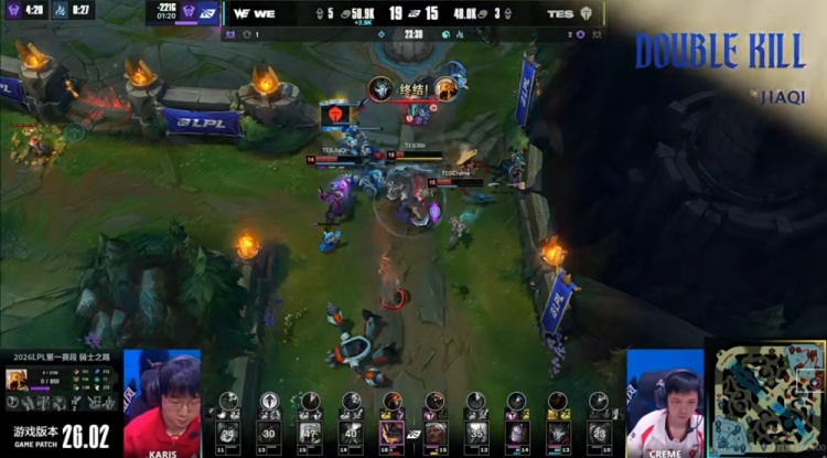 [19:02]TES拿下小龙之后Fengyue妮蔻大招强开四个,但是队友跟不上!Monki斯卡纳反手钳住两个配合上了Cube兰博大招!Karis沙皇进场推回三个让Cube兰博可以贴脸火烤拿下双杀!这波虽然About厄斐琉斯再度倒下,但正面又是WE的1换3!WE领先2K了!