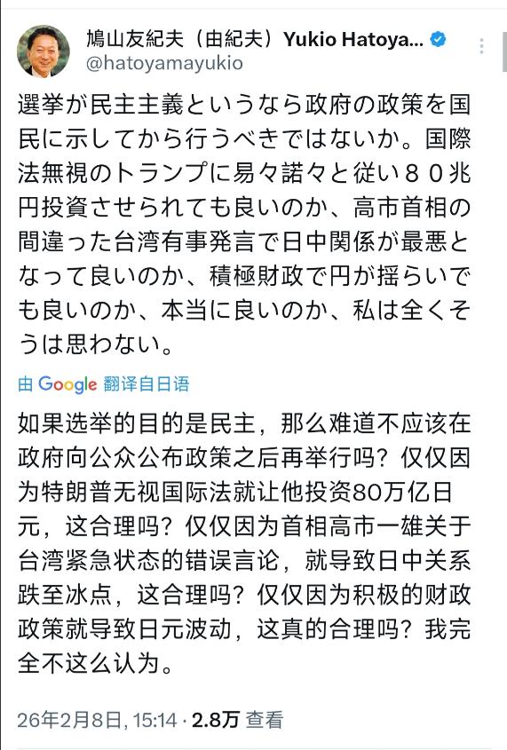 日本前首相鸠山由纪夫今天(2月8日)写道:“如果选举真的是民主的体现,难道不应该在向国民明确政府政策之后再进行吗?我们真的可以默许,政府在无视国际法的特朗普面前唯命是从,白白投入80万亿日元吗?真的能接受高市首相在台湾问题上的错误言论,让日中关系恶化到谷底吗?真的可以任由积极财政政策,导致日元汇率动荡不安吗?真的可以吗?我绝不这么认为。” 要知道,民主的核心要义在于,让民众基于明确信息做出选择,选举作为民主的重要载体,本应建立在清晰的政策公示基础上。 日本当前的选举实践,却存在明显偏差,最高法院曾多次裁定,参议院和众议院选举处于“违宪状态”,核心问题出在选区划分不公,不同选区选民的选票价值,差距最大可达2.10倍,人口多的选区与人口少的选区,在议席分配上未能体现公平。 更关键的是,此次众议院选举从解散到投票仅间隔16天,创下二战后最短纪录,如此仓促的选举周期内,各政党根本无法向国民充分阐释具体政策细节,选民只能凭借模糊的党派标签或短期口号投票,使得选举沦为巩固执政基础的工具,而非真正的民意表达。 这种缺乏明确政策导向的选举模式,本质上背离了民主的初衷,让民众失去了基于实质内容进行选择的权利,也为后续政府推行争议政策埋下隐患。 对美投入的80万亿日元,本质上是日本政府对美国战略的被动迎合。这笔巨额资金并非基于日本自身发展需求,而是源于美日贸易协议中的承诺,主要流向美国能源基础设施和半导体产业,包括核反应堆建设、电网改造等项目。 日本政府通过国际协力银行提供7.18万亿日元的低息贷款和担保,还额外拨款3.53万亿日元作为政府担保,这些资金大多来自国债发行和财政挪用,直接加重了日本的财政负担。 更值得关注的是,这笔投资缺乏明确的回报保障,美国能源项目的市场前景和技术风险尚未明确,而日本企业和金融机构却要承担巨大的担保压力,政府系金融机构的贷款担保额度已创下历史新高。 这种在特朗普政府压力下的妥协式投入,完全无视日本国内的民生需求,相当于将国民的税收和未来的财政空间,用于满足美国的战略诉求,最终只是为他国发展买单,并未给日本带来实质性的经济收益或安全保障。 高市首相在台湾问题上的错误言论,是对中日关系基本准则的严重背离,也是对地区稳定的不负责任。 台湾问题纯属中国内政,这是国际社会公认的事实,《日中联合声明》早已明确这一核心立场,但高市首相却将“台湾有事”与日本“存亡危机事态”挂钩,暗示军事介入台海局势,这种言论直接突破了中日关系的政治红线。 这种错误导向不仅加剧了地区紧张局势,更给日本经济带来直接冲击。中日互为重要贸易伙伴,日中关系恶化导致中国访日游客锐减,关键材料进口面临受阻风险,多个依赖中国市场的日本产业陷入困境。 同时,这种言论背后反映出日本执政团队的右翼倾向,其推动的强军扩武行径,正在动摇日本战后和平体制,国内有识之士担忧军国主义死灰复燃,这种发展方向与日本国民追求和平、稳定发展的诉求完全相悖,最终只会让日本在外交上陷入孤立,经济上承受损失。 积极财政政策的过度推行,已成为日元汇率动荡的重要诱因。日本政府近年来频繁推出大规模经济刺激计划,从39万亿日元的综合经济对策到28.1万亿日元的经济刺激计划,资金规模不断扩大,但政策精准度严重不足。 能源补贴采用无差别方式,既惠及高收入人群和企业,又加重了财政负担,对低收入家庭的帮扶效果有限;家庭补贴以是否缴纳居民税为标准,导致很多真正需要帮助的低收入劳动家庭无法受益,而部分储蓄丰厚的老龄家庭却能领取补贴。 这些政策不仅未能有效拉动经济增长,一年对GDP的拉动效果仅约1.0%,还导致政府债务高企,市场对日元信心持续下滑。 近期日元兑人民币汇率波动明显,兑美元汇率也长期处于低位,汇率动荡直接推高了进口成本,日本大米等生活物资价格持续上涨,普通民众的生活压力不断加大。 这种只追求短期政治效应、忽视长期经济规律的积极财政政策,本质上是用未来的财政空间换取眼前的政策支持,最终只会让日元的稳定性进一步丧失,经济发展陷入恶性循环。 这些问题并非孤立存在,而是相互关联、相互影响。 选举中政策不明确,导致政府缺乏坚实的民意基础,进而在对外政策上更容易屈服于外部压力,对美巨额投入和对华错误言论都反映出决策的短视性;而积极财政政策的滥用,既是为了掩盖国内治理的短板,也是为了维系执政支持率,最终却加剧了经济动荡。 这些现象的核心矛盾在于,日本当前的政府决策更多围绕政治私利和外部诉求,而非国民的根本利益,导致民主流于形式、外交陷入被动、经济面临风险,这正是鸠山由纪夫提出一系列质疑的深层原因。