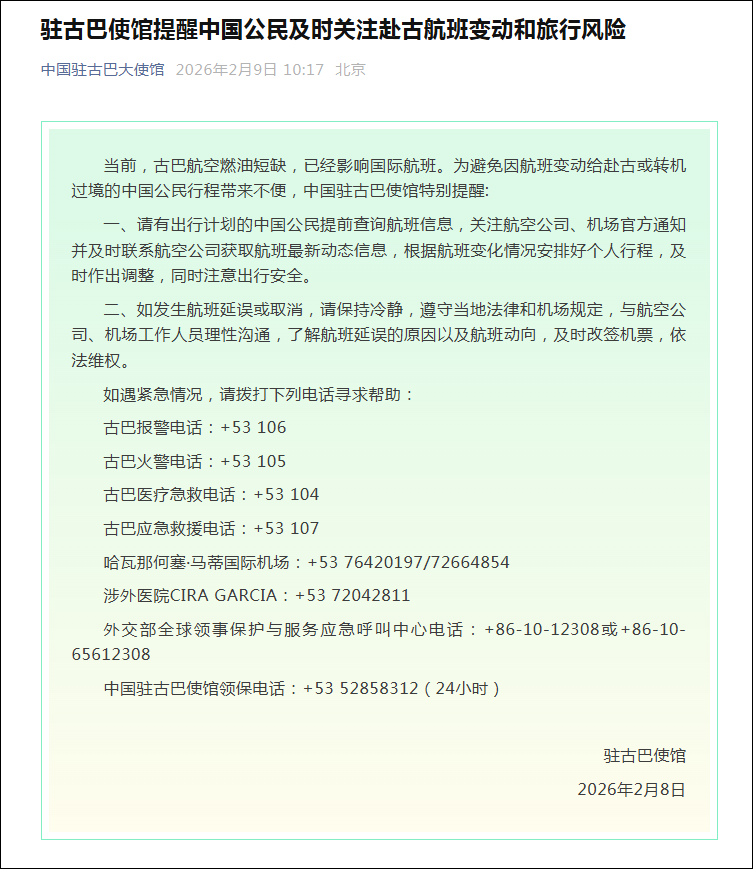 9日,我驻古巴使馆发布通告,提醒中国公民及时关注赴古航班变动和旅行风险。通告指出,古巴航空燃油短缺已经影响国际航班。